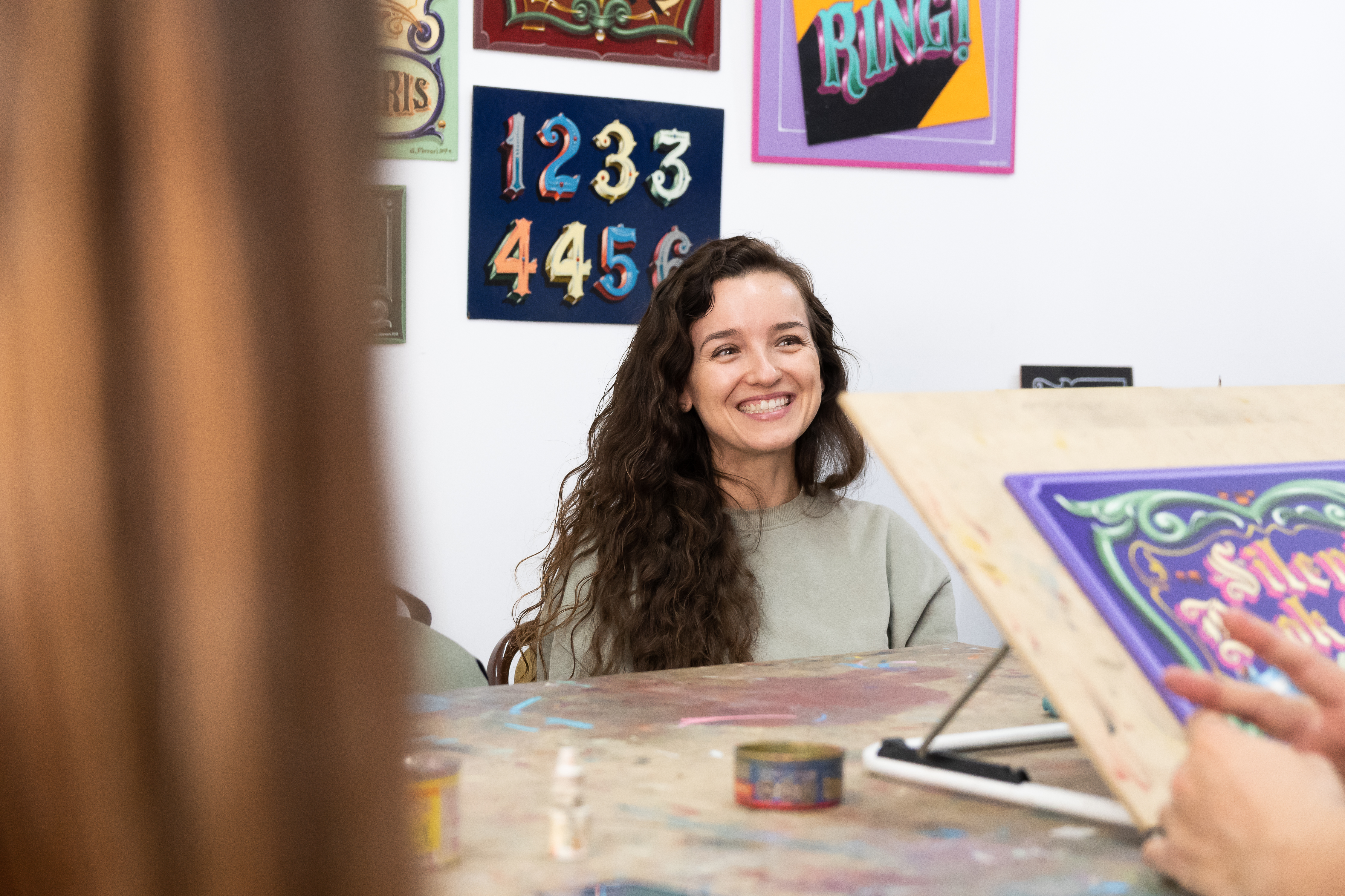 Empezamos a dar talleres de fileteado y letras pintadas a mano, por separado. Con el tiempo la gente que hacía el taller inicial nos preguntaba si podían continuar, entonces ahí abrimos talleres para avanzados y con esos alumnos, que ya vienen hace 3 años, estamos haciendo la muestra. Se transformó en un espacio social. Sacamos la cuenta el otro día y pasaron más de 600 personas en estos años en los diferentes talleres que dimos.