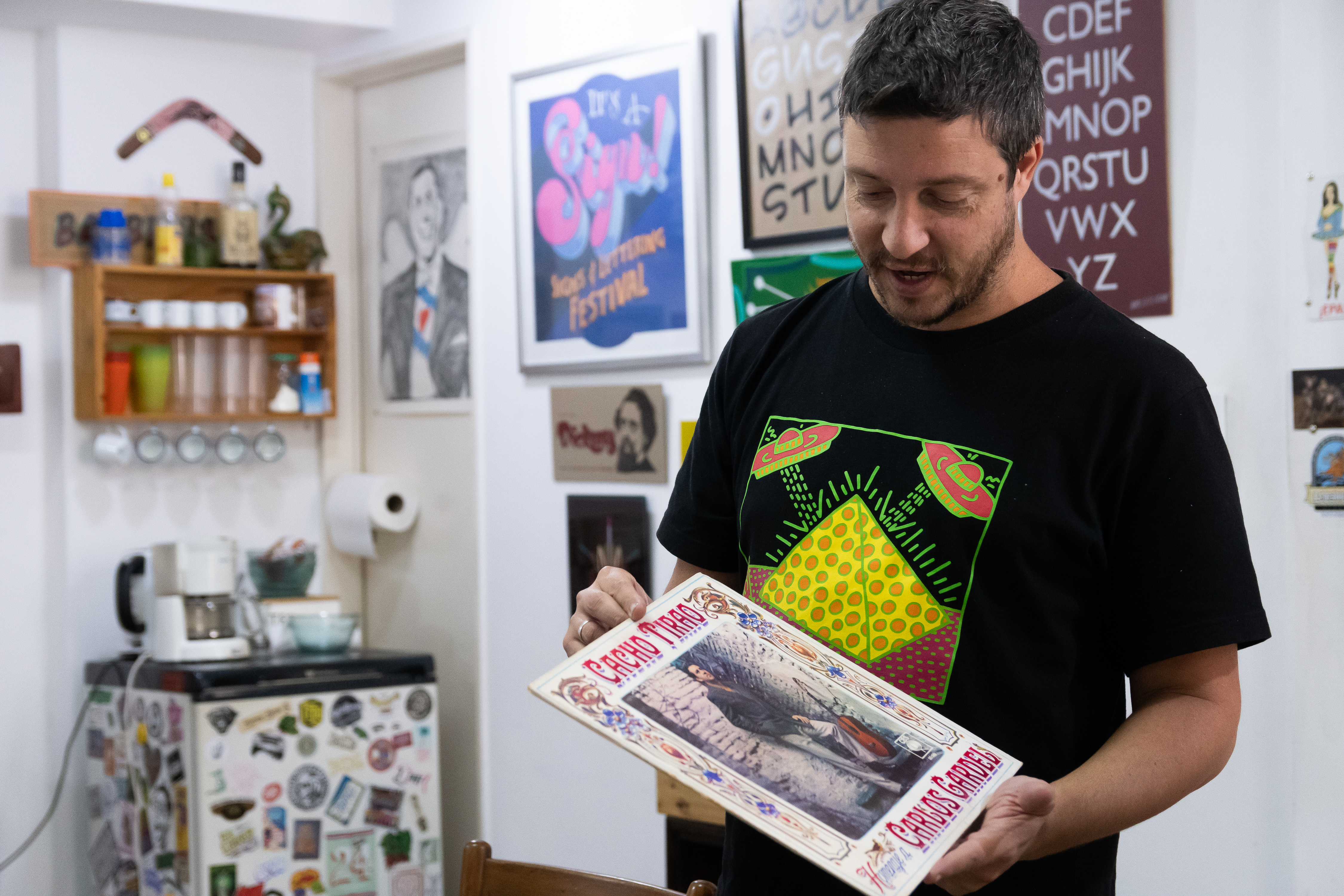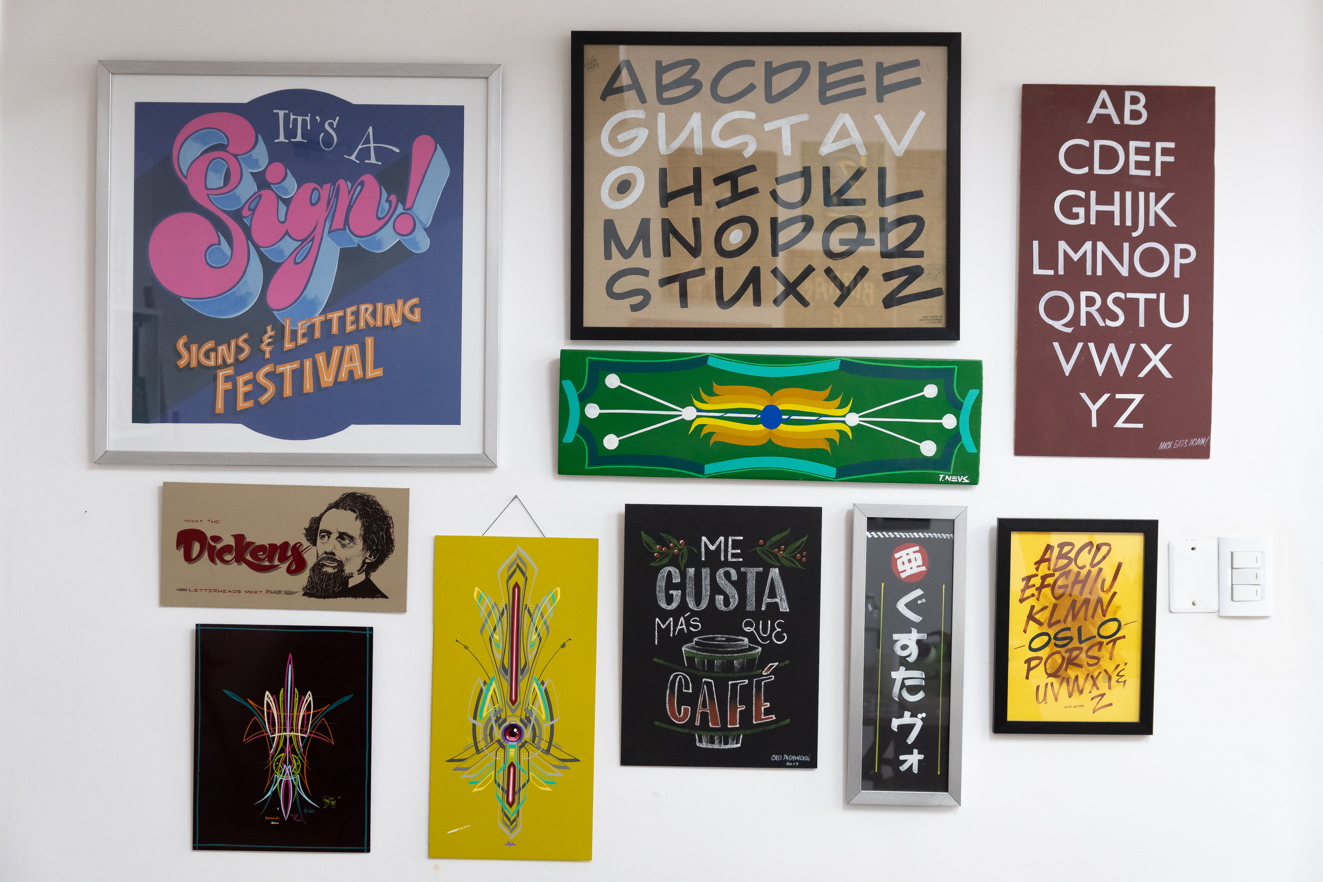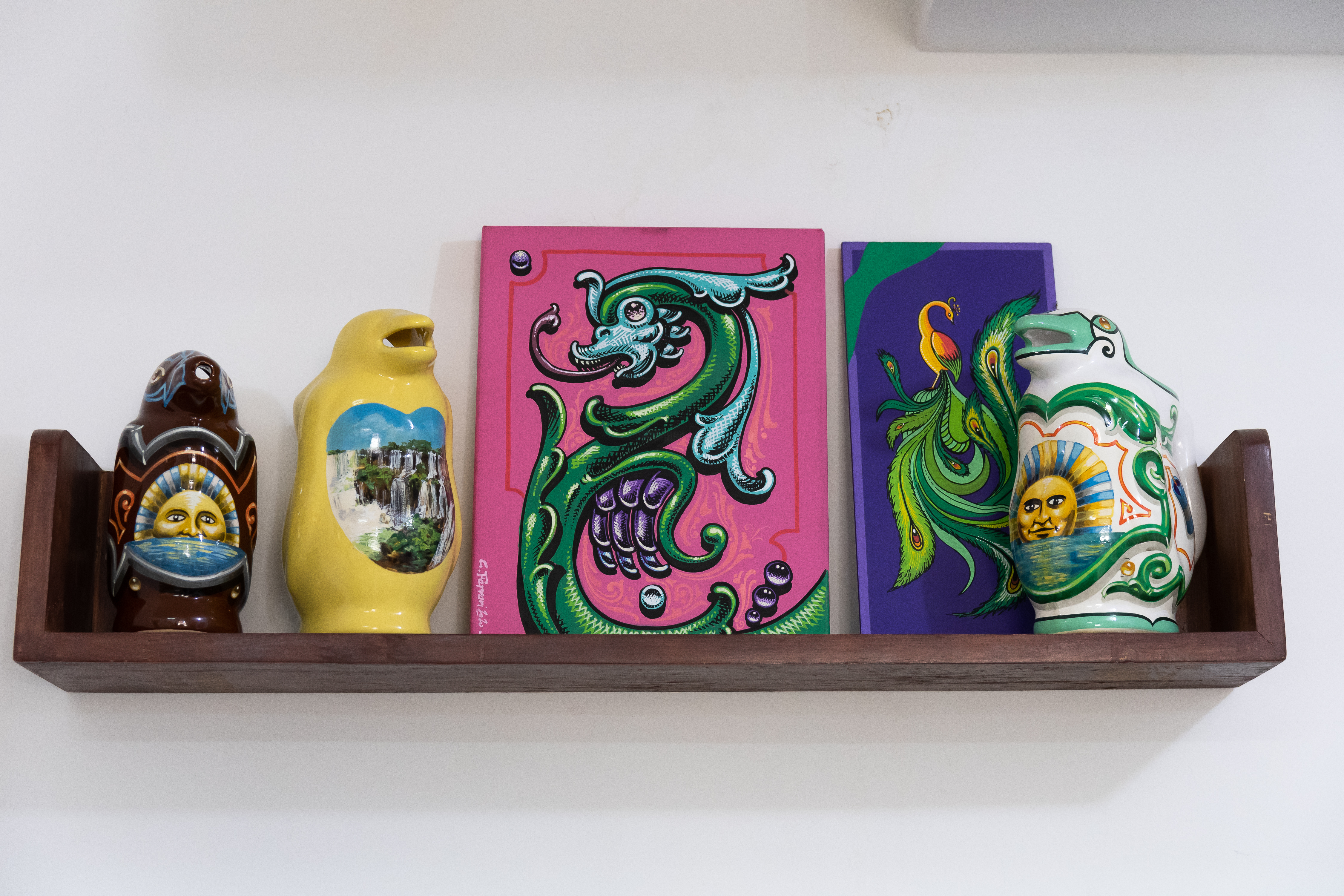 Mirando un poquito alrededor, ya empiezo a identificar qué obras son suyas y cuáles son regalos o intercambios con otros artistas. Los colores más fuertes – rosas, magentas, violetas y aquas – son “sello Gustavo”, pero lo loco es que también lo son obras sumamente innovadoras de fileteados con dragones en blanco y negro. En las paredes hay un interesante popurrí; carteles bien tangueros, abecedarios tipográficos, letras más estrambóticas y otras más rectas, pinturas – estas son de Nina, su mujer rusa – pingüinos con arte, carteles gigantes que pertenecieron a algún comercio, un “qué mirá bobo” y más, mucho más.