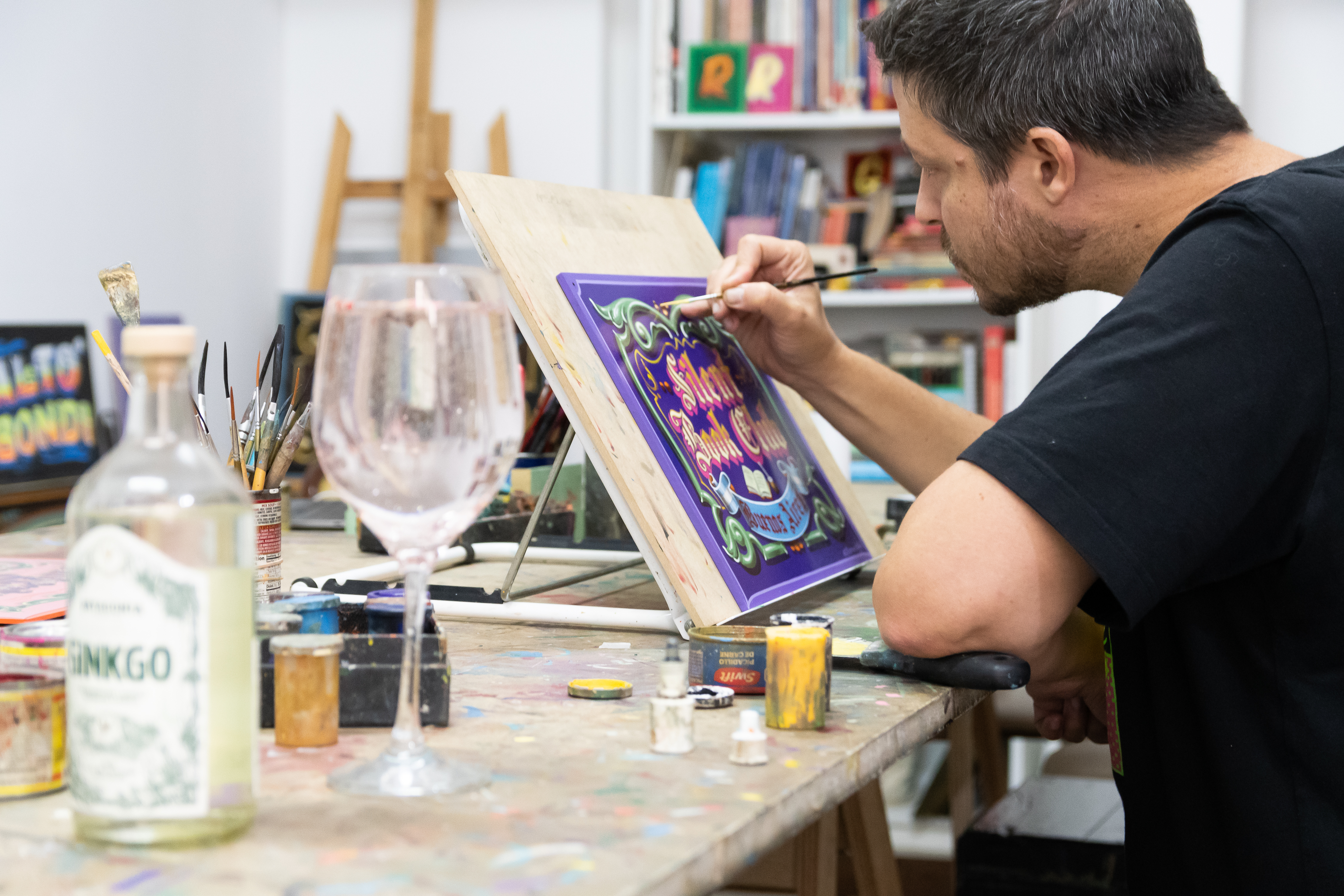 Gin con artistas: desde el taller de Gustavo Ferrari y sus fileteados bien power. Por Lenchu Rodríguez Traverso. Fotos: Alexis García Sánchez (Alesso) para MALEVA.