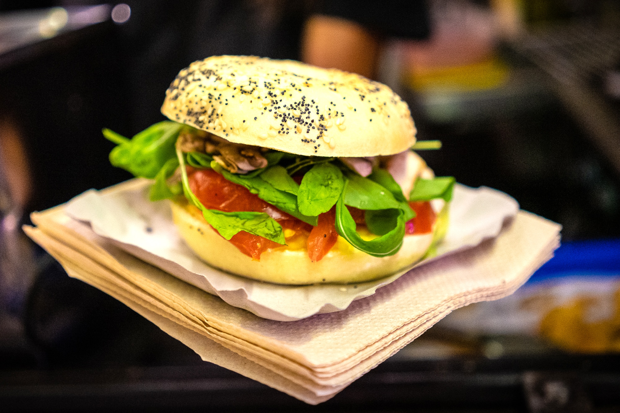 La casa de los bagel ofrece varias opciones para los vegetarianos, como esta hamburguesa de hongos, tomate, queso crema con cebolla de verdeo y el toque justo de oliva. Las semillas de amapola juegan a la calesita sobre el pan de rosca. Es un plato light porque las calorías, del pan y los ingredientes, son bajas. Un verdadero vergel en rosquilla. ($250)