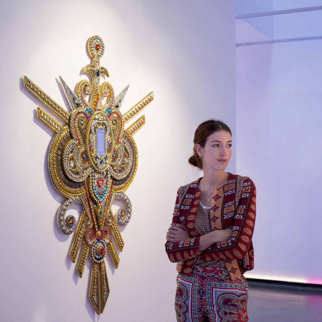 ¡Atentos! La muestra es imperdible y se podrá ver hasta el 22 de diciembre. Portadora de un look que va en armonioso composé con las obras, la genial artista conversó un largo rato con MALEVA.