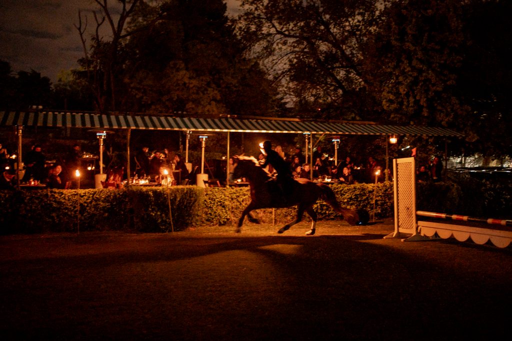 De miércoles a sábados desde las 20h hay malabaristas que hacen pruebas con fuego, jinetes, músicos y DJ’s en vivo que acompañan a los comensales (cuatro por mesa) durante su estadía en el Club Hípico Argentino.