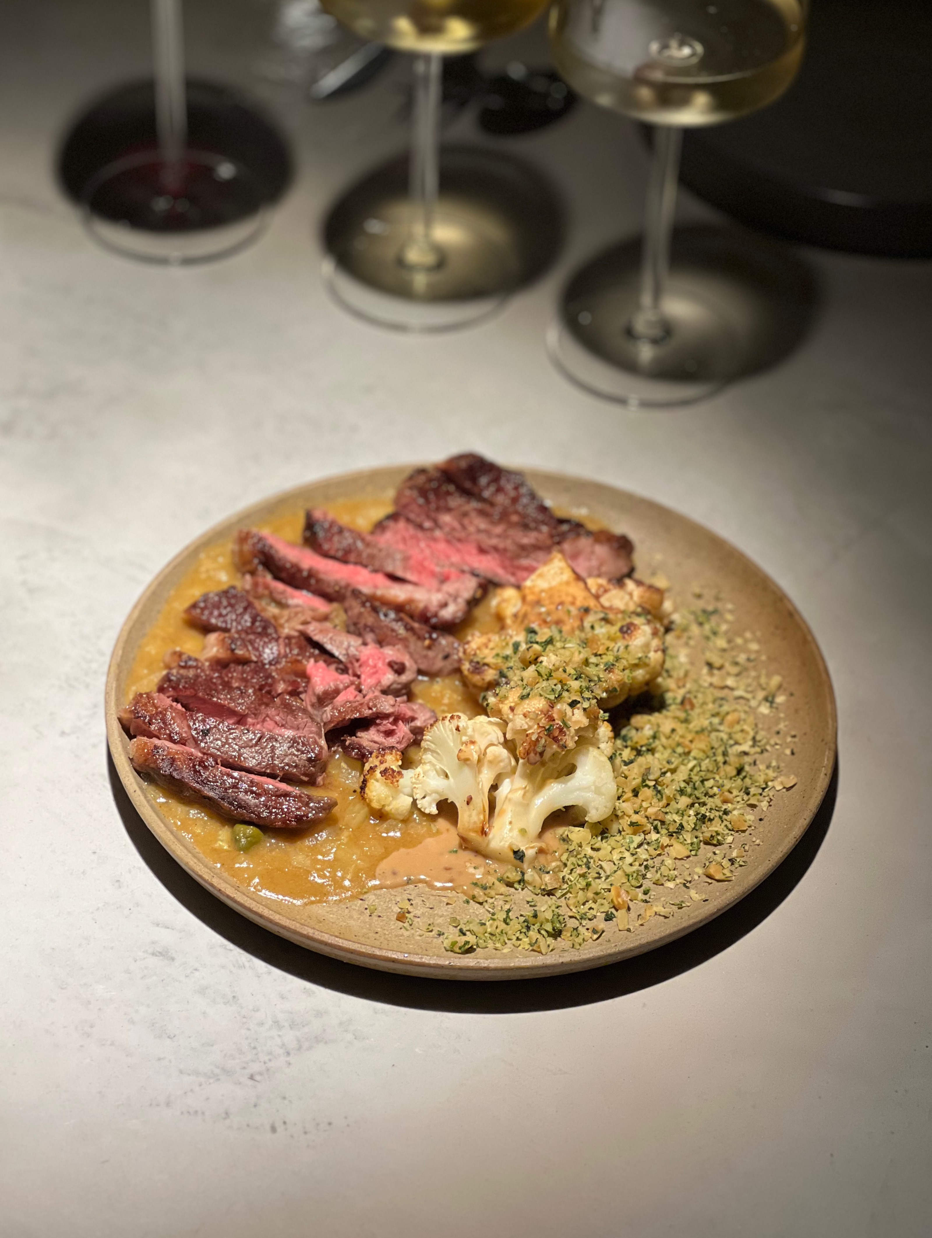 «“El ojo de bife argentino se puede comer solo y será muy sabroso. Pero cuando se busca una experiencia más intensa, con sabores más ricos, hay que experimentar. Esa fue la inspiración de este plato que está en carta todo el año. Acompañamos la carne con coliflor en salsa gamadari y maní…»