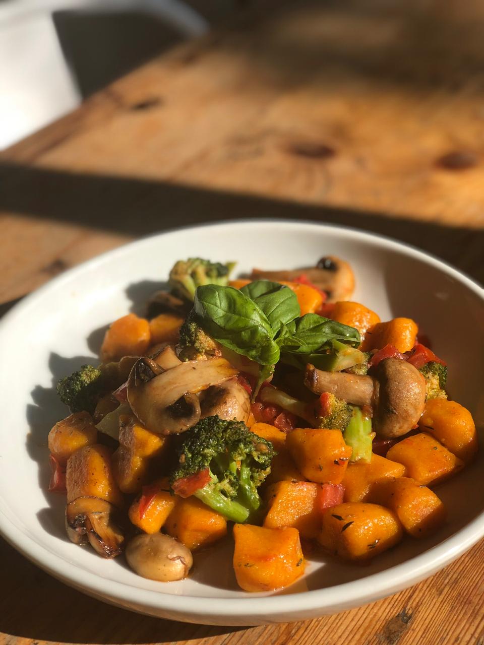 A diferencia de lo que uno presupone, los dueños no son vegetarianos. Pero admiten que: «les encanta la potencialidad, variedad y posibilidades que aportan los vegetales en la cocina». La carta varía según la estacionalidad de los productos y según lo que se encuentra en el mercado. Para el invierno en casa proponen un plato medio picantón y especiado: el curry de zapallo con garbanzos y leche de coco. Una de las novedades de cuarentena e ideal para las noches frías es la lasaña de kale y portobellos. La masa está hecha con un toque de vermut blanco que le aporta un sabor particular. Sale con bolognesa de hongos y bechamel. También incorporaron un zapallo relleno hecho al rescoldo con portobellos, choclos, ají de verdeo, miso y un crocante de garbanzos.