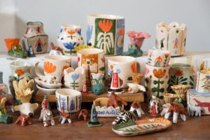 Si bien hoy en día integró algunas herramientas digitales a su proceso creativo, conectar con lo analógico es parte esencial de su arte. Quizás sea por eso que la cerámica se volvió otra pata esencial de su producción. “La primera vez que empecé a dibujar con un IPad sentía que me faltaba algo. Meses después me di cuenta que era el ruido del lápiz y el olor particular del policromo 146”. Me asombro con la especificidad, y me cuenta que en la facultad sus compañeros le hacían chistes con que se sabía los números exactos de cada color de policromo. Esa pasión atraviesa todo el proceso de trabajo, que arranca, como lo llama ella, en el “horario de panadería”, cuando llega a Yoli 7 a.m, y se despliega también en el ritmo nocturno. “Hay procesos que siento que no pueden esperar, no se pueden demorar”, expresa.