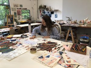 Su proceso creativo es todo menos lineal. Garabatea mientras mira una película o charla con alguien y días después vuelve a esos cuadernos para encontrar ahí una idea que crece. Al principio se deja llevar por un impulso. “De repente me levanto pensando que tengo ganas de hacer collage y voy a la librería, me compro papeles, hago de forma bastante caótica y después se ordena cuando entiendo qué formato va a tomar cada cosa”, cuenta.