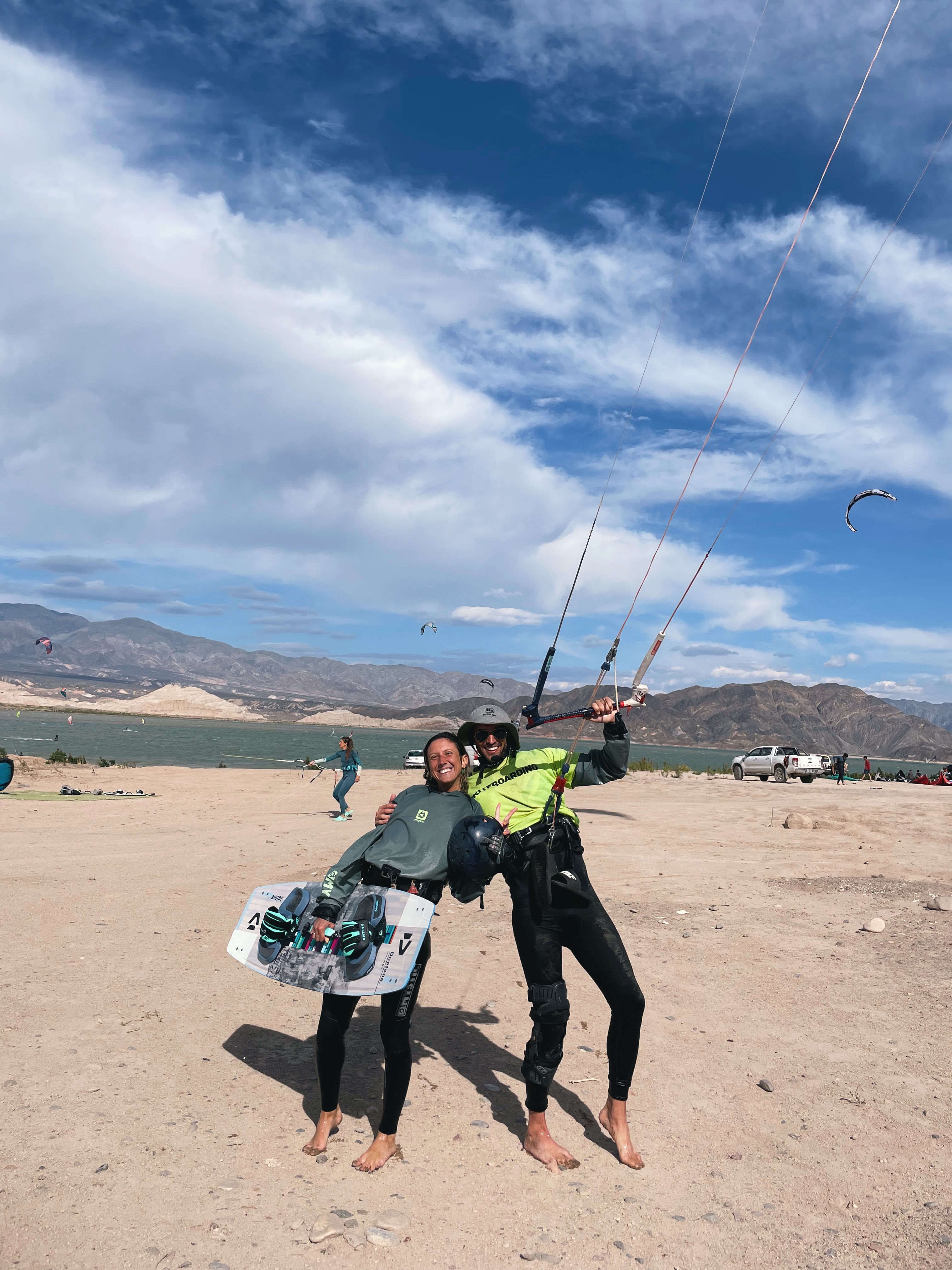 El movimiento del kite algo familiar me resultaba. De chica, cuando me iba de vacaciones con papá a Miramar, llevábamos un cometa y era el plan de la tarde volarlo en la playa. El funcionamiento es más o menos el mismo, así que no costó tanto agarrarle la mano. Con eso apenas dominado, Mati me agarró atrás del arnés y me dijo: “ahora vamos a cruzar el dique haciendo Body Drag, y nos vas a llevar vos” (una técnica para andar más bien acostada, con la tabla bajo el brazo y arrastrada por la fuerza del kite). Los instantes de adrenalina iniciales se combinaron con un tremendo asombro: el ser arrastrada, sobre el agua, con esa vista, el brillo turquesa, la cordillera nevada… lo pienso y todavía me emociona.