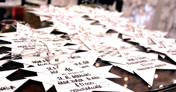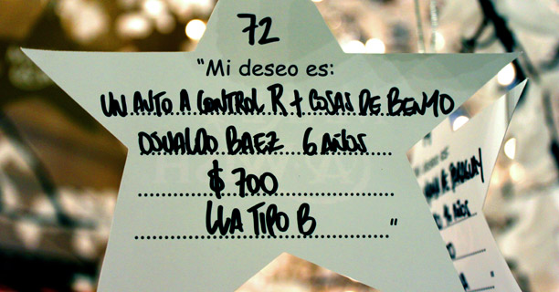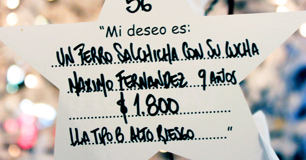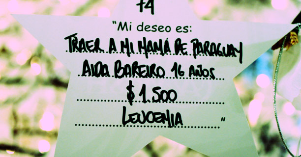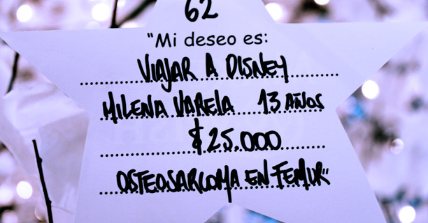 ¿Y en época de navidad?Tenemos un árbol en el Alvear, en el hall, que son cien sueños para apadrinar. Ya se apadrinaron 58 y calculo que se van a apadrinar todos. Este es el quinto árbol que hacemos. Nosotros en el árbol ponemos estrellas en las que consta el nombre del chico, la edad, la enfermedad, el sueño que pidió y el valor estimado. Y la gente puede venir desde que se inauguró el 3 de diciembre hasta el 6 de enero y apadrinar un sueño. En todos los casos los invitamos a si quieren participar cuando los cumplimos.