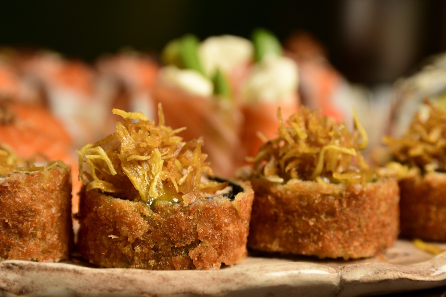 Otra buena opción como entrada o como complemento de otras piezas de sushi es el Roll Barranco, que está frito, se consume tibio y es perfecto para la época. Se trata de un bocado sin arroz relleno con mucho salmón, queso philadelphia, palta y verdeo, envuelto en alga, todo rebozado en panko y frito, terminado con hilos de batata frita y aderezo de miel y mostaza. El alga, el rebozado y las batatas fritas provocan una sensación extra-crocante muy especial.