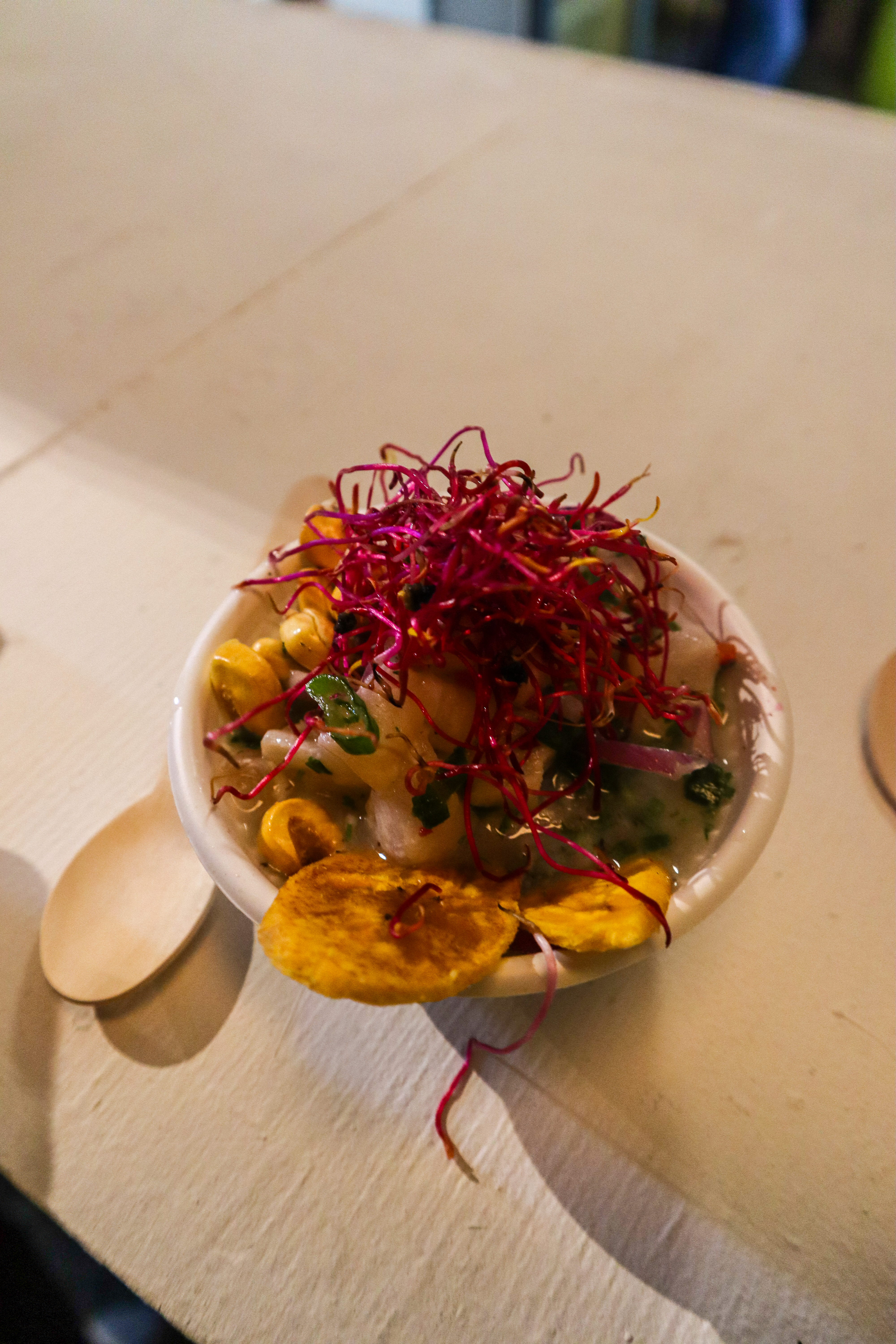 La propuesta de Rocoto es sencilla: cada bocado te hace viajar. De un bocado, uno puede sentirse en el mar Mediterráneo o en una playita Latinoamericana. Lo fundamental es dejarse llevar por los sabores. “El ceviche la está rompiendo, es la estrella”, asegura Fernando Dvoskin detrás su colorido stand. Su especialidad está elaborada con lenguado fresco curado, leche de tigre, chips de plátano frito, maíz cancha y queda coronado con unos brotes de remolacha.