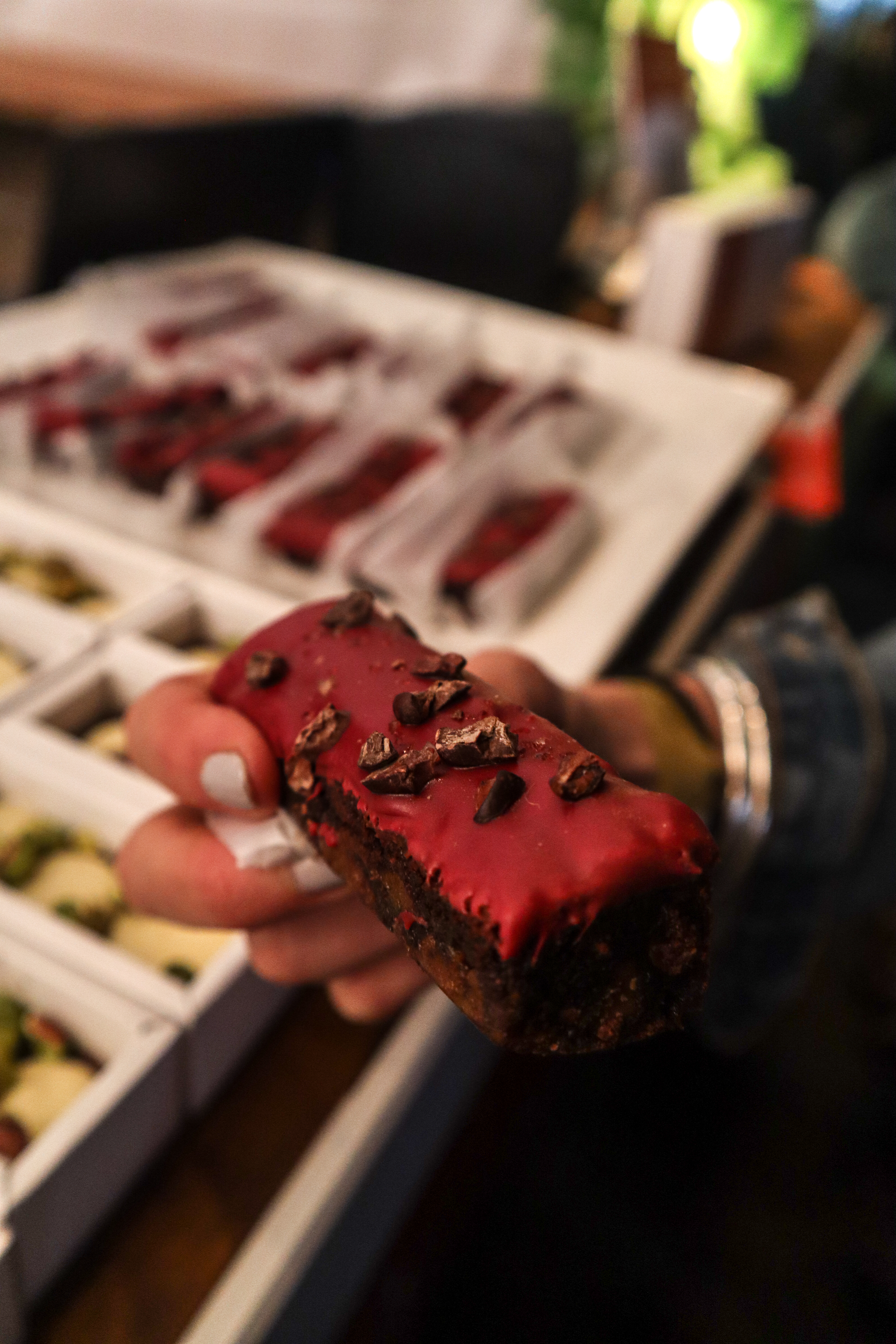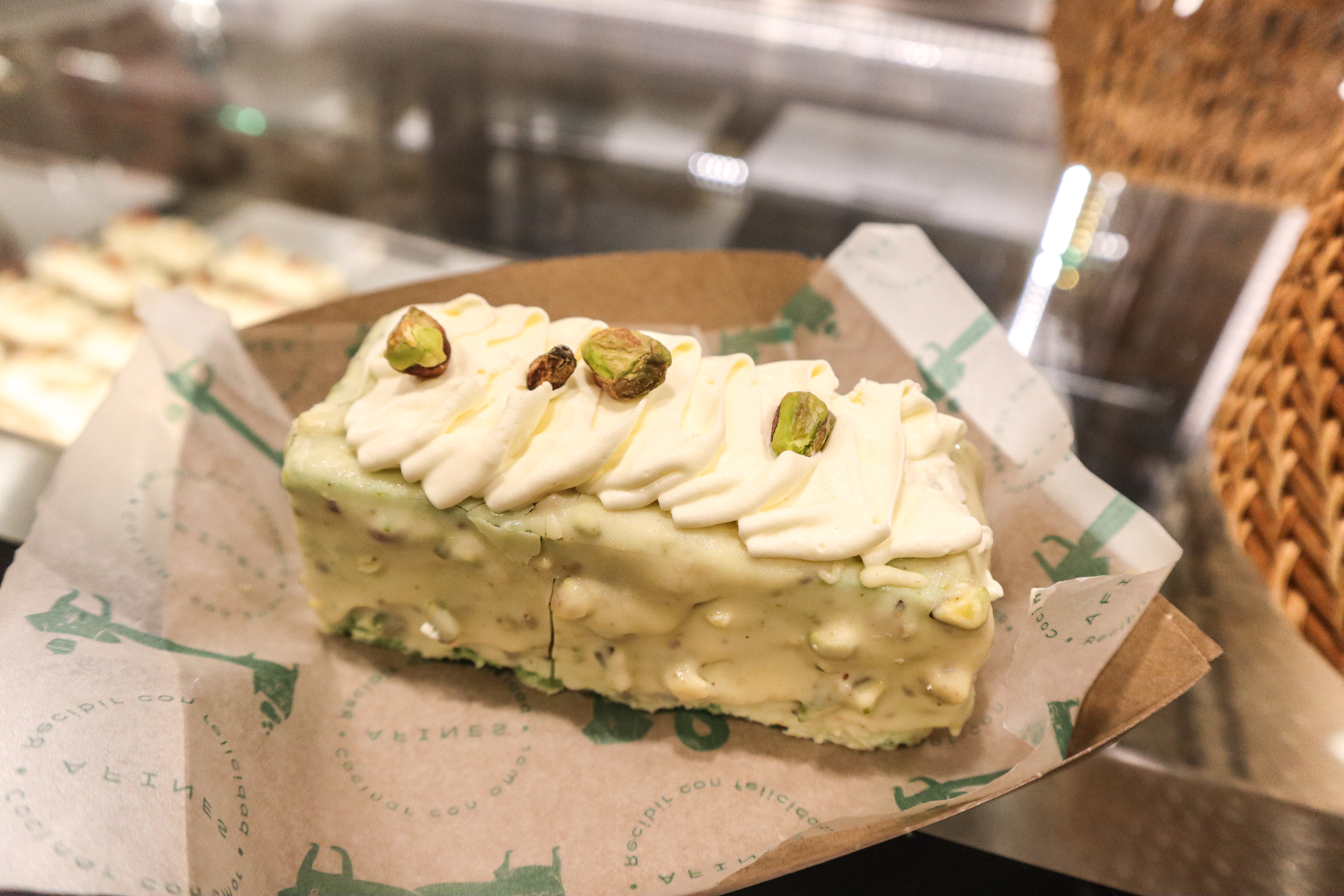 Húmedo, algo crocante y con el sabor inigualable del pistacho, el lingote de la pastelera Loli Dodds es poético e ideal para terminar el recorrido de Bocas bien arriba. “Está siendo la estrella del día”, afirma Loli, con una sonrisa, sobre su creación. Tiene un bizcochuelo de vainilla con dos capas de crema frangipane de pistachos, baño de chocolate blanco, y se corona con una lluvia de pistachos y crema chantilly. Una verdadera delicia.