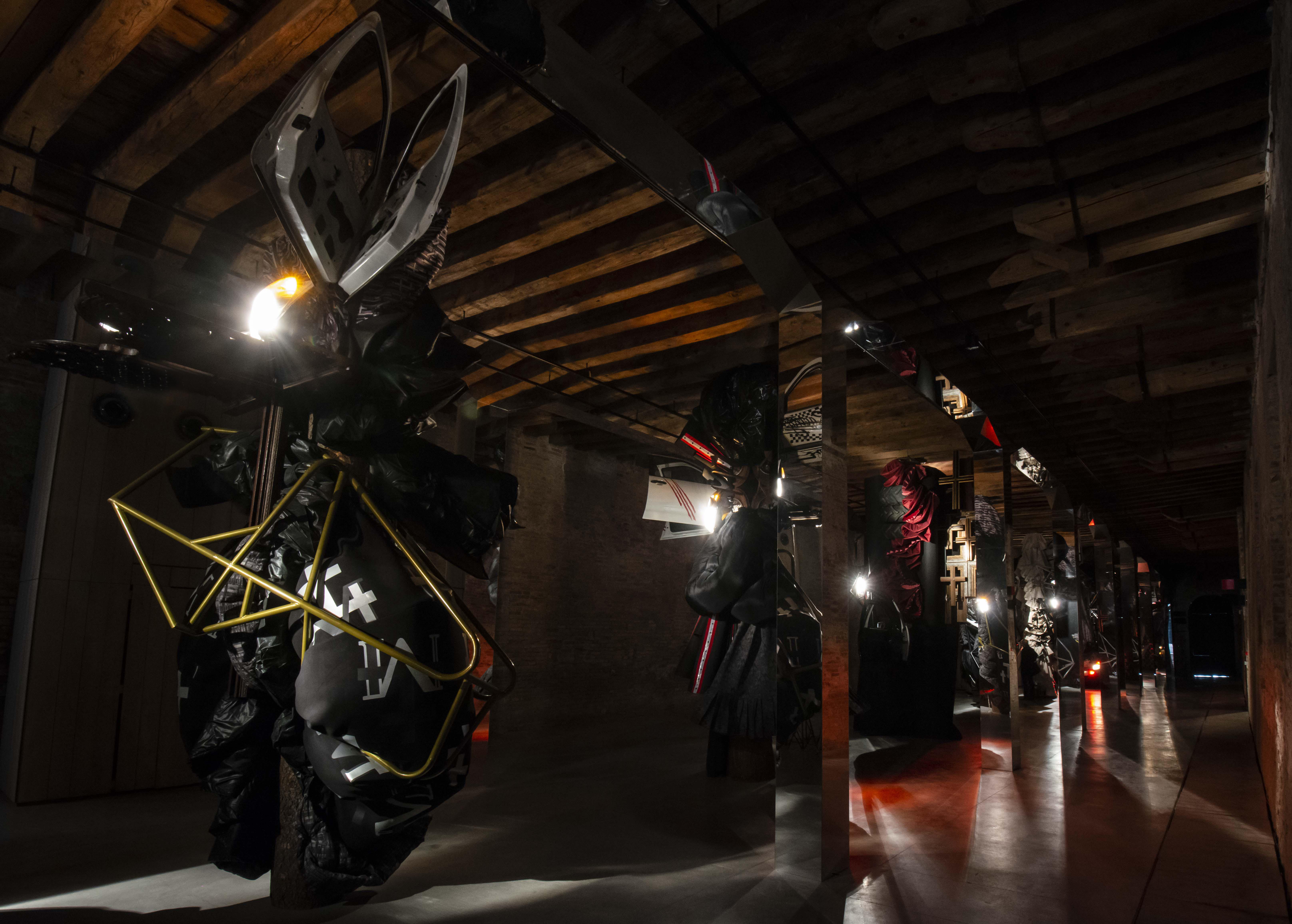 Ella desarrolló esculturas gigantes, a simple vista hechas de materiales industriales, retorcidos, desechados. El pabellón estaba completamente oscuro, por lo que era difícil diferenciar las distintas cosas que componían la estructura. Las mismas eran siete y monumentales, actuaban como obras que invocan un sentido “punk Frankestein-esque bestiario” que de una manera representan la desacralización de conceptos como la iconografía religiosa, la moda, el espectáculo y la naturaleza, mundos que presentan jerarquías horizontales.