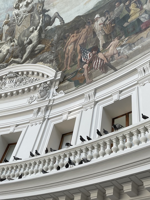 La sala principal es muy imponente, volví a sentir esos escalofríos que extrañaba, al descubrir un nuevo espacio de arte. Mirando hacia arriba se vislumbran los frescos de la cúpula del 1800 con la temática del antiguo paradigma de los 5 continentes. Una bandada de palomas, que parecen reales, descansan en la cúpula.