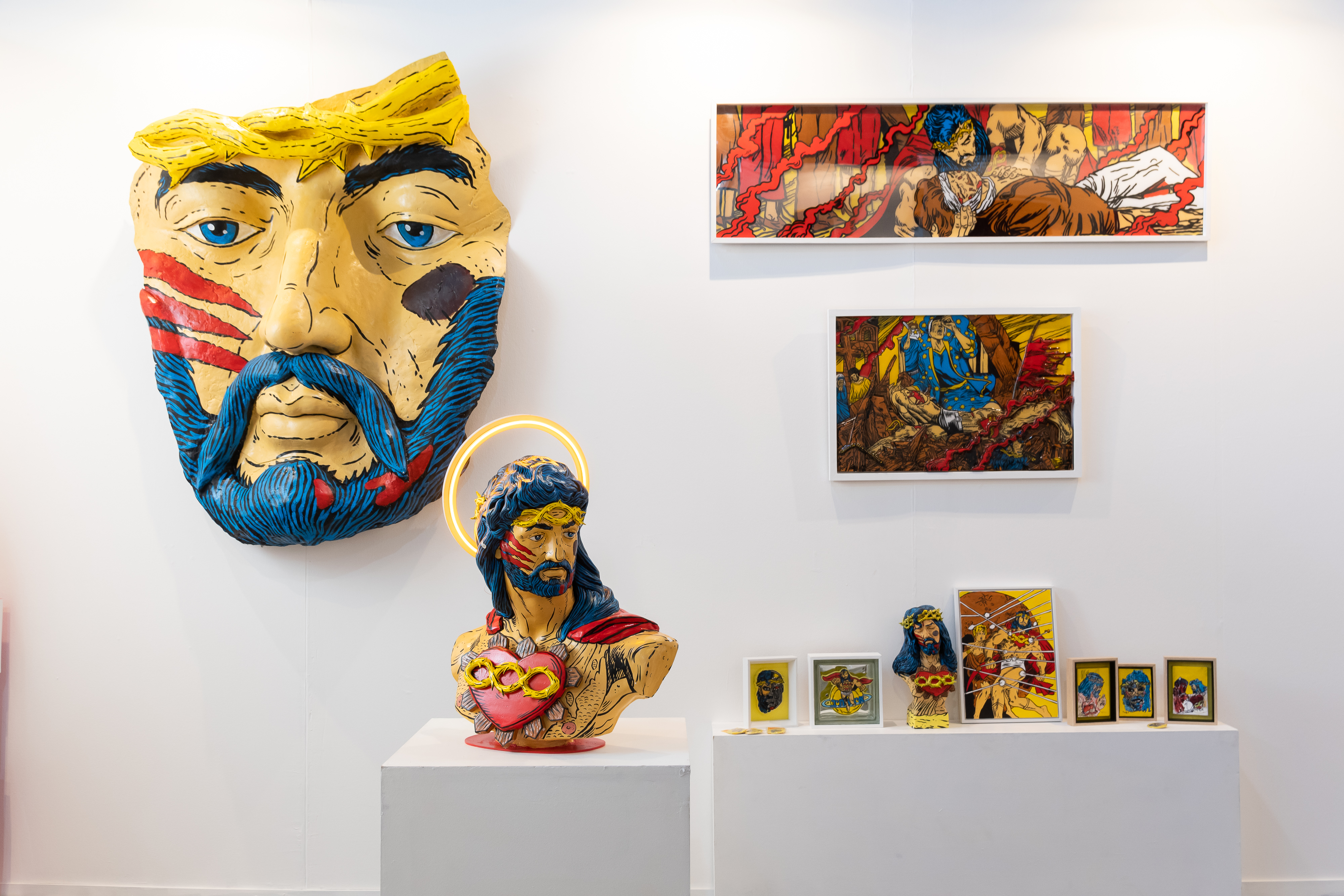 Un gran stand, mucho azul y rojo, barbies y obras con temáticas religiosas que visualmente remiten a superhéroes. Hay una Virgen María con reminiscencias a la Mujer Maravilla y un estudio de las caras de Cristo en vínculo con Superman. Son las creaciones de Pool y Marianela en Whatever happened to the lamb of God?