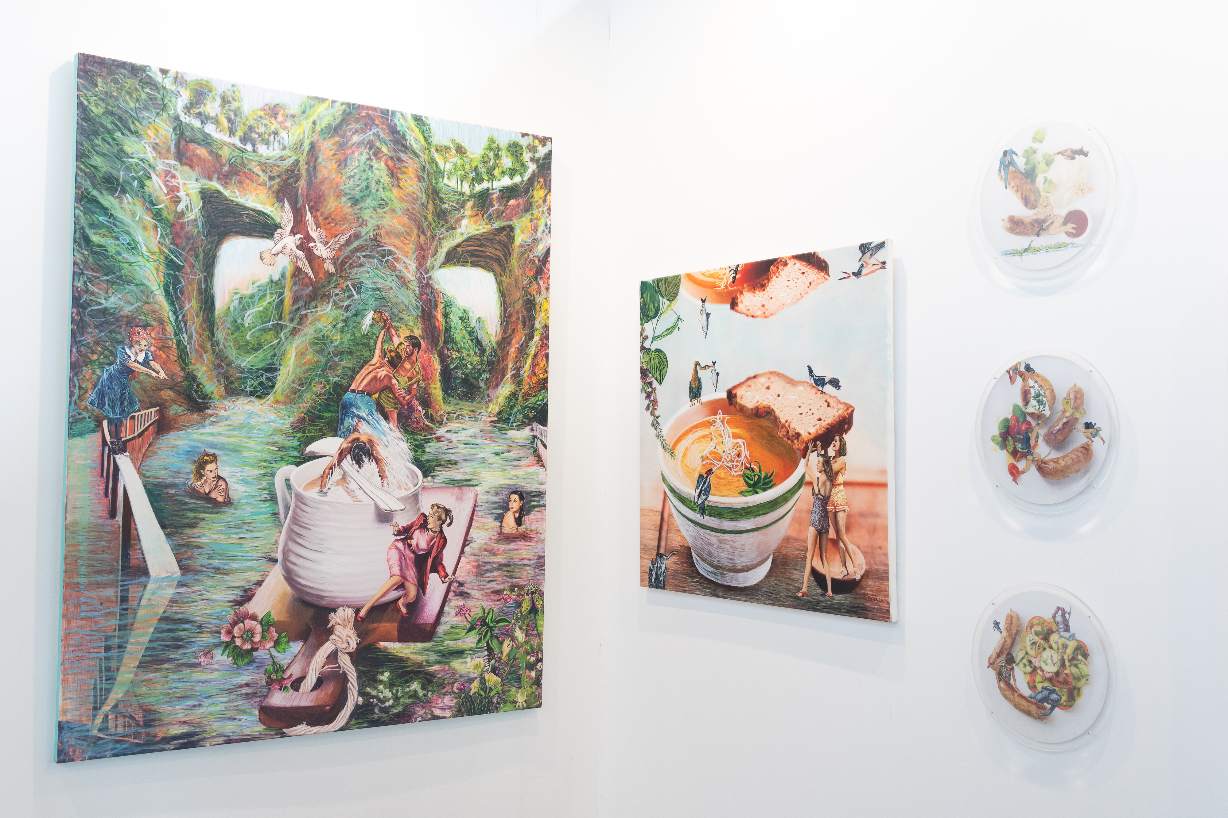 “Aunque en apariencia Las tres gracias de Rubens y el death metal son opuestos, ambas formas pueden considerarse como un modo de catarsis o tal vez una manera de explorar aspectos más oscuros de la vida y la experiencia humana” explica Nicolás Romero Escalda en su cuenta de Instagram, medio por el cuál conoció e interactúa con su galería en Argentina. Romero Escalada vive en Madrid y desde allí envió una serie de óleos en los que trabaja con los mecanismos simbólicos de los objetos de consumo diario. “Además de su procedimiento, en estas pinturas Nicolás es muy pop en su técnica”, nos contó Charlie, representante de la galería.