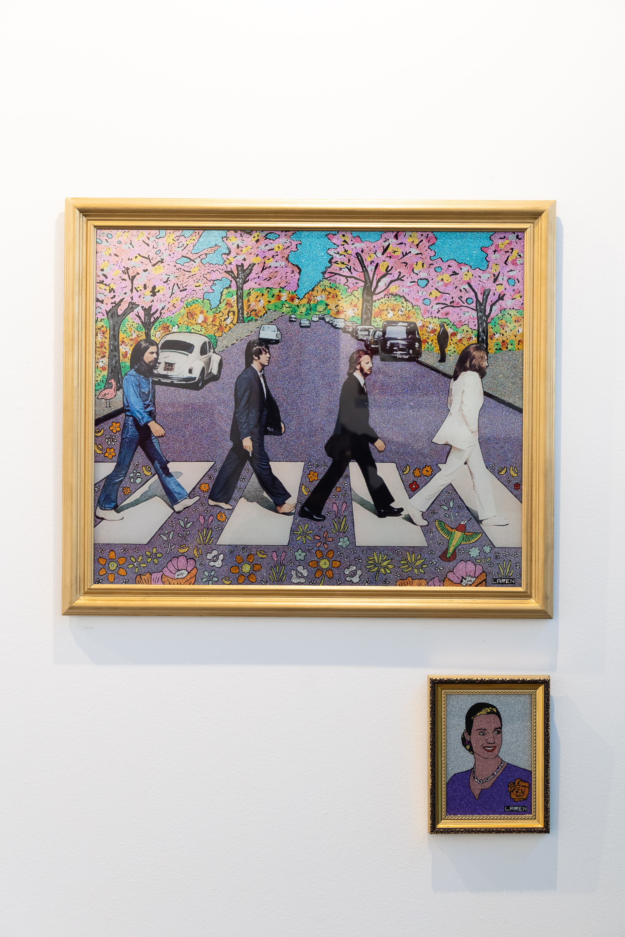Con guiños a la industria cultural vemos a los Beatles cruzando una Abbey Road violeta, una Evita símil al Díptico de Marilyn de Warhol, una coca cola en miniatura rodeada de sus chapitas y una Mona Lisa con la cara del propio artista. Es Benito Laren y desde la galería presentan su solo show. Reinan las piezas en material holográfico dotándolas así de un particular brillo multicolor.
