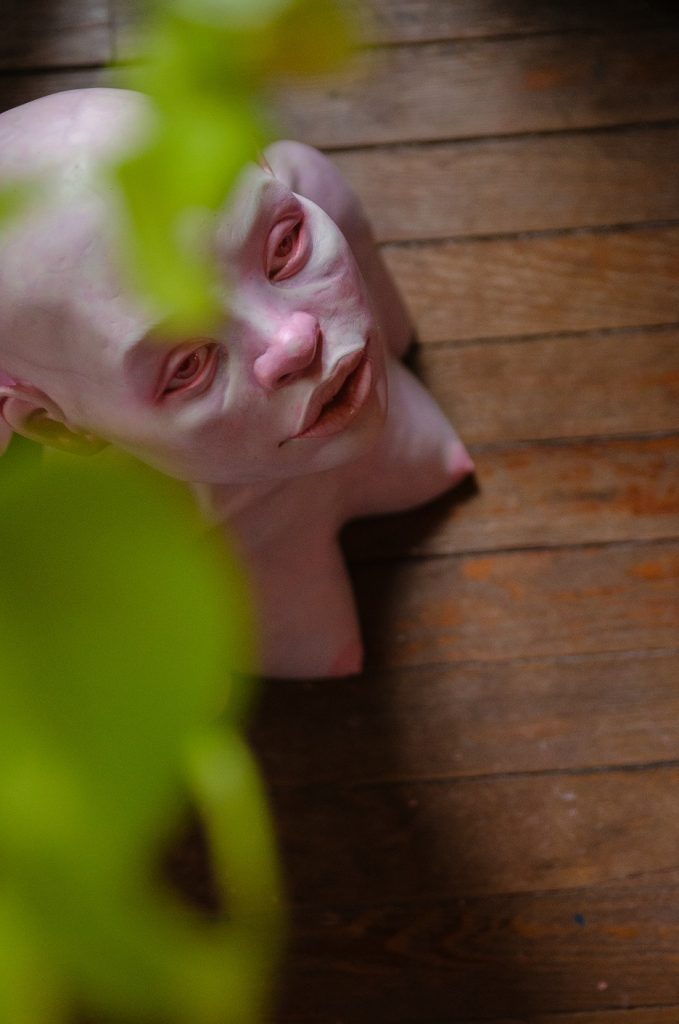 Al ingresar a su taller, luego de haber subido unas escaleritas de madera, se activan todos los sentidos. El olor a café recién hecho se filtra por la derecha, donde hay una pequeña cocina en colores rosa y verde. La suave música se esparce de a poquito, creando un ambiente alegre e íntimo. La naturaleza brota tanto por fuera de las ventanas, como por dentro. Potus, helechos, floreros hechos por ella en cerámica y con flores naranjas terminan de conquistar el espacio. Uno que transmite en su colorido, exuberante y extraño modo la original personalidad de esta multifacética artista que se describe principalmente como pintora.