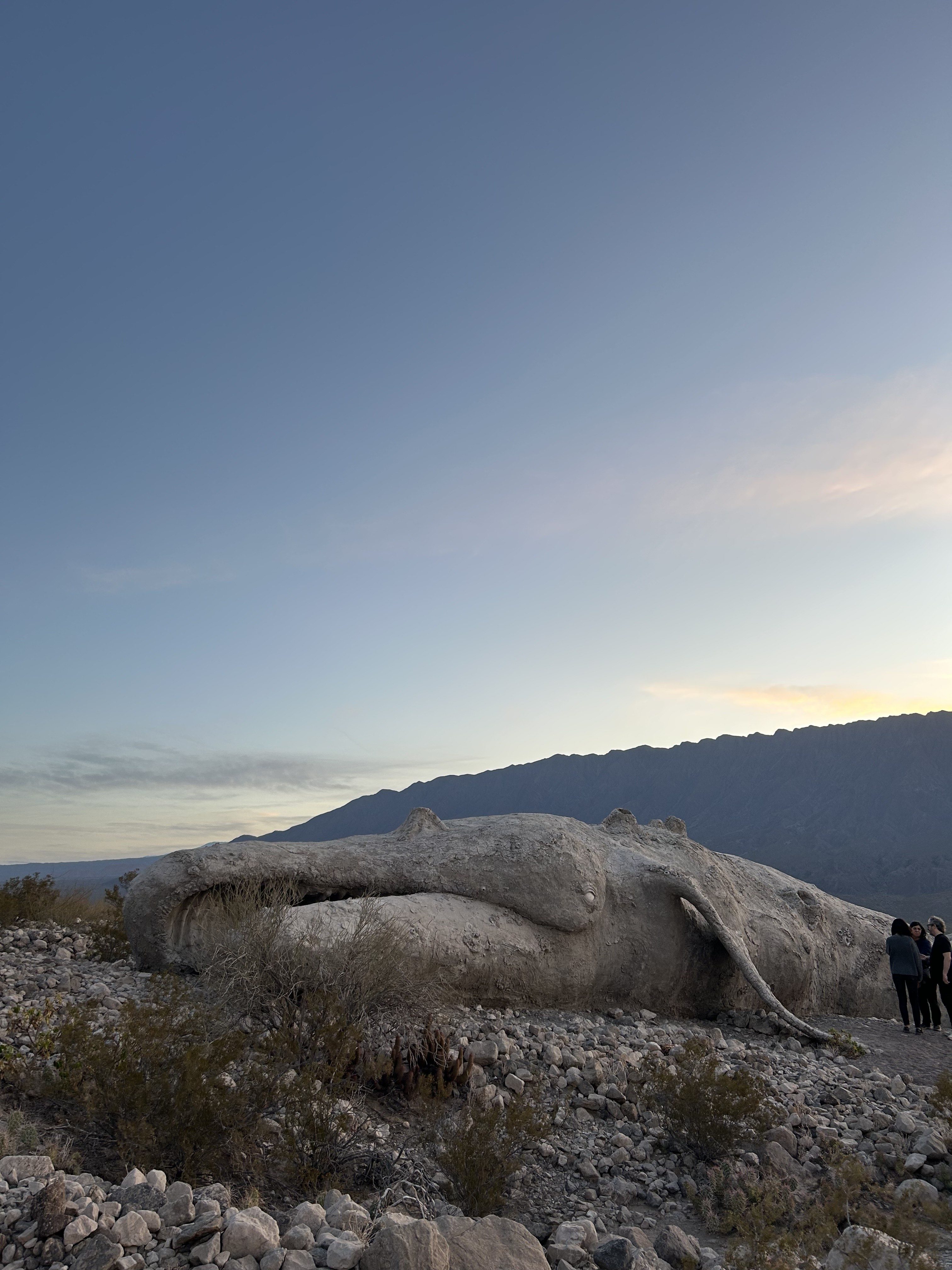 Empezamos por los nidos, casitas de adobe, orgánicas e irregulares, como las montañas, que a su vez funcionan como refugio para los animales. Seguimos con una instalación de Mariana Telleria, de troncos altísimos, perfectamente alineados, encuadrando la postal de la montaña inmensa de fondo. Las “dinobolas” de Nicola Constantino están esparcidas por un sector del parque, mientras un equipo de cinco personas construye la versión más grande de todas. El refugio “bombardeado” de Eduardo Basualdo, se erige solitario entre las plantas silvestres. Y el atardecer iluminaba la gran ballena de Adrián Villar Rojas, pionera del proyecto, construida y dando de qué hablar hace quince años.