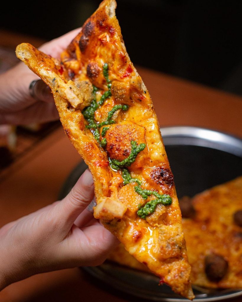 Inspirado en todos esos lugares, pero con identidad propia abrió hace pocos meses Togni’s: pizzas hechas con harina orgánica y agua filtrada, masa madre y reposo en frío de 24 horas. Su menú va desde pizza de mozzarella con pepperoni (hecho en el local, con una receta de la casa y madurado en una cava a la vista), albóndigas y salchicha italiana, una pizza de milanesa con pollo con pesto (sí, pizza de milanesa), hasta la vegana de queso de cajú, hongos, vegetales asados y aceite de hierbas. Se pueden pedir por porciones de 26 cm y más fina, rectangular de molde de 21×26 cm, más gruesa o enteras de 50 cm de diámetro con masa fina. Y siguiendo el estilo de Estados Unidos se pueden doblar las porciones al comerlas,