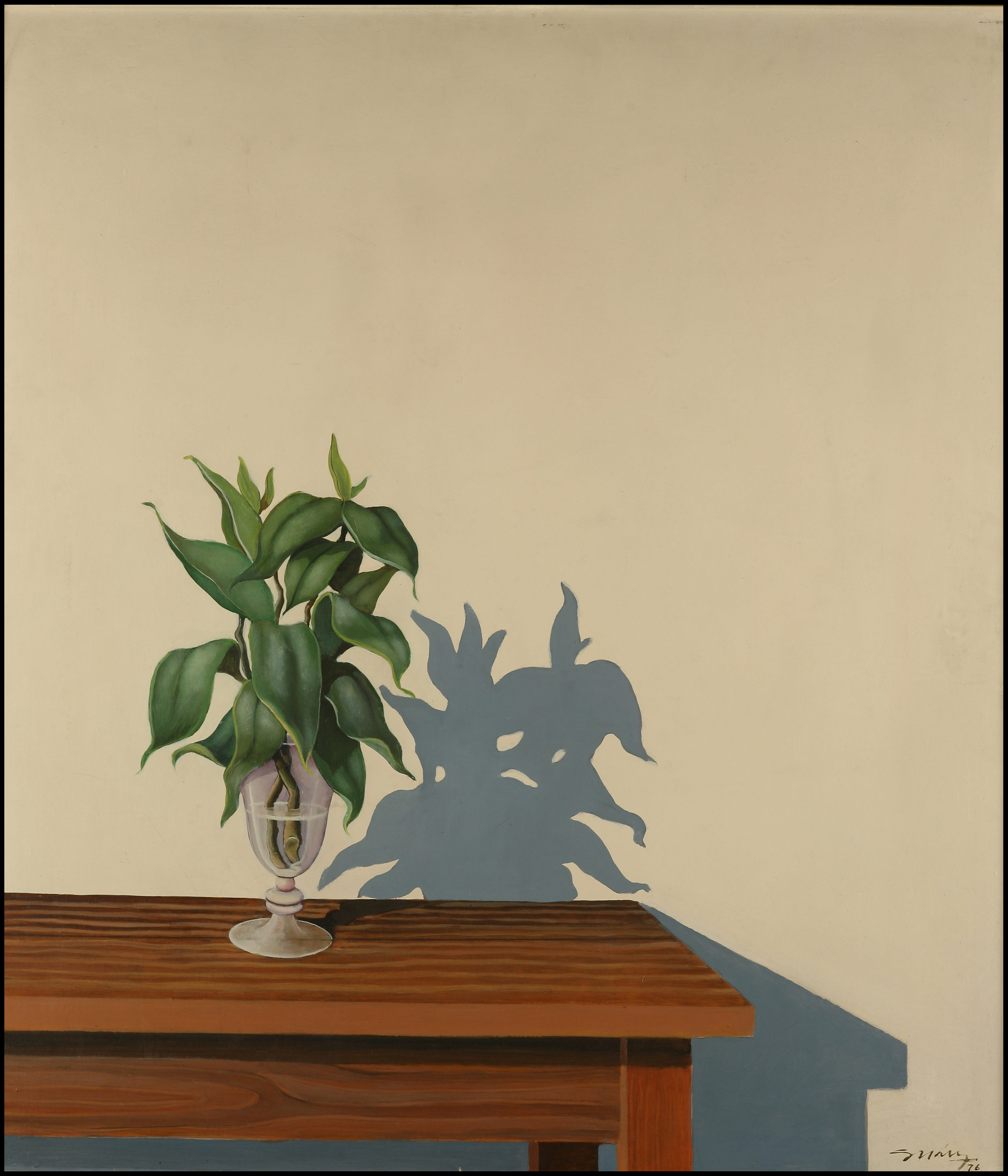 Al avanzar a la siguiente sala, no solo cambiamos de estilo pero también parecería que cambiamos de museo. Alfombras grises, paredes verdes/grises e incluso sócalos parecen transportarnos al living de una casa, decoradas con las naturalezas muertas pintadas por Suárez en los ochenta. Plantas, radios antiguas, y azulejos reales incorporados al canvas del artista demuestran el mismo nivel de observación y pretensión de realismo figurativo que aquellas personas de yeso aguardándonos del otro lado. Un reflejo de una era cruda y oscura de la Argentina representada en Tiempos de Guerra (1982) donde un diario descansando sobre la mesa lee “Argentina hundió un destructor”.