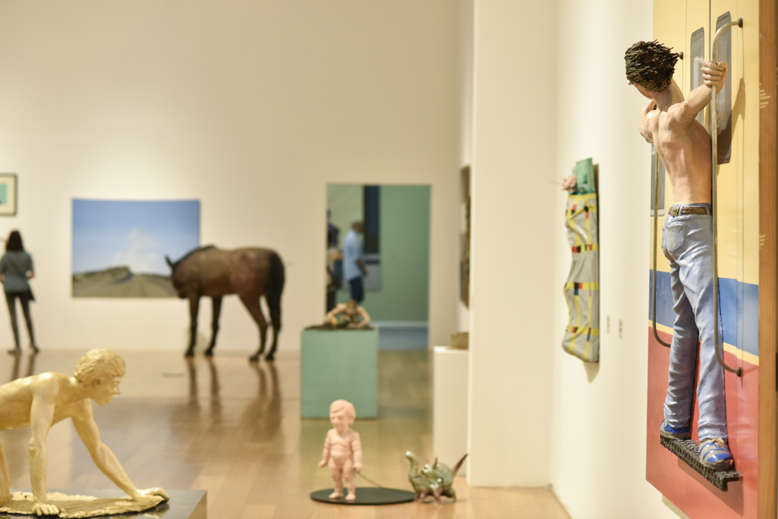 Tras el caballo, toda la obra posterior del artista aguarda. “Creo que no se pueden entender los años 90 sin Pablo Suárez”, afirma Cippolini en su texto curatorial. Serpientes mirando la televisión, personajes cubiertos en pasto sintético, los perlados “chongos exhibicionistas”, Exclusión (1999), el emblemático muchacho colgando del tren que todos ya vimos alguna vez en la colección permanente del MALBA, e incluso una algo inquietante muñeca con luces led en los ojos son claro testimonio de la naturaleza experimental de Suárez en su búsqueda por acercarse cada vez más al hombre contemporáneo.