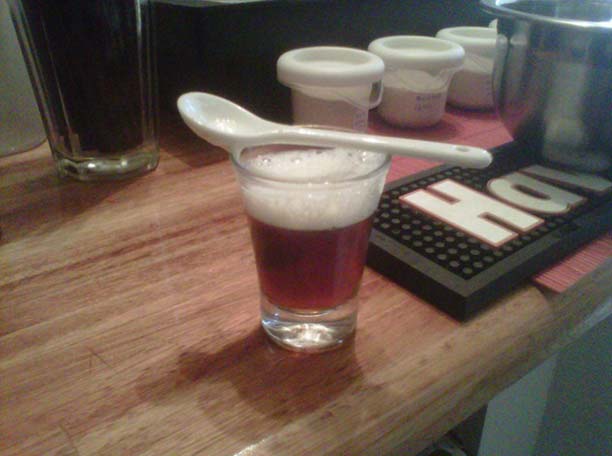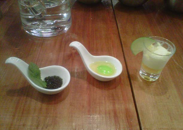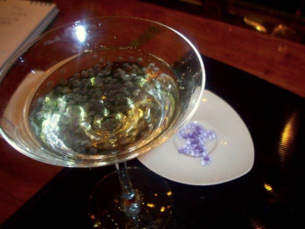 Aceites moleculares. Izquierda: Aceite de Vainilla y Oro (en contraste con un cóctel «metalizado» a base de Ron Light, Stregga, Té Ahumado y Syrup de Amarena). Derecha: Aceite de Frutos Rojos (sobre un cóctel de gin destilado, hojas frescas de alcanfor y syrup de fresas)
