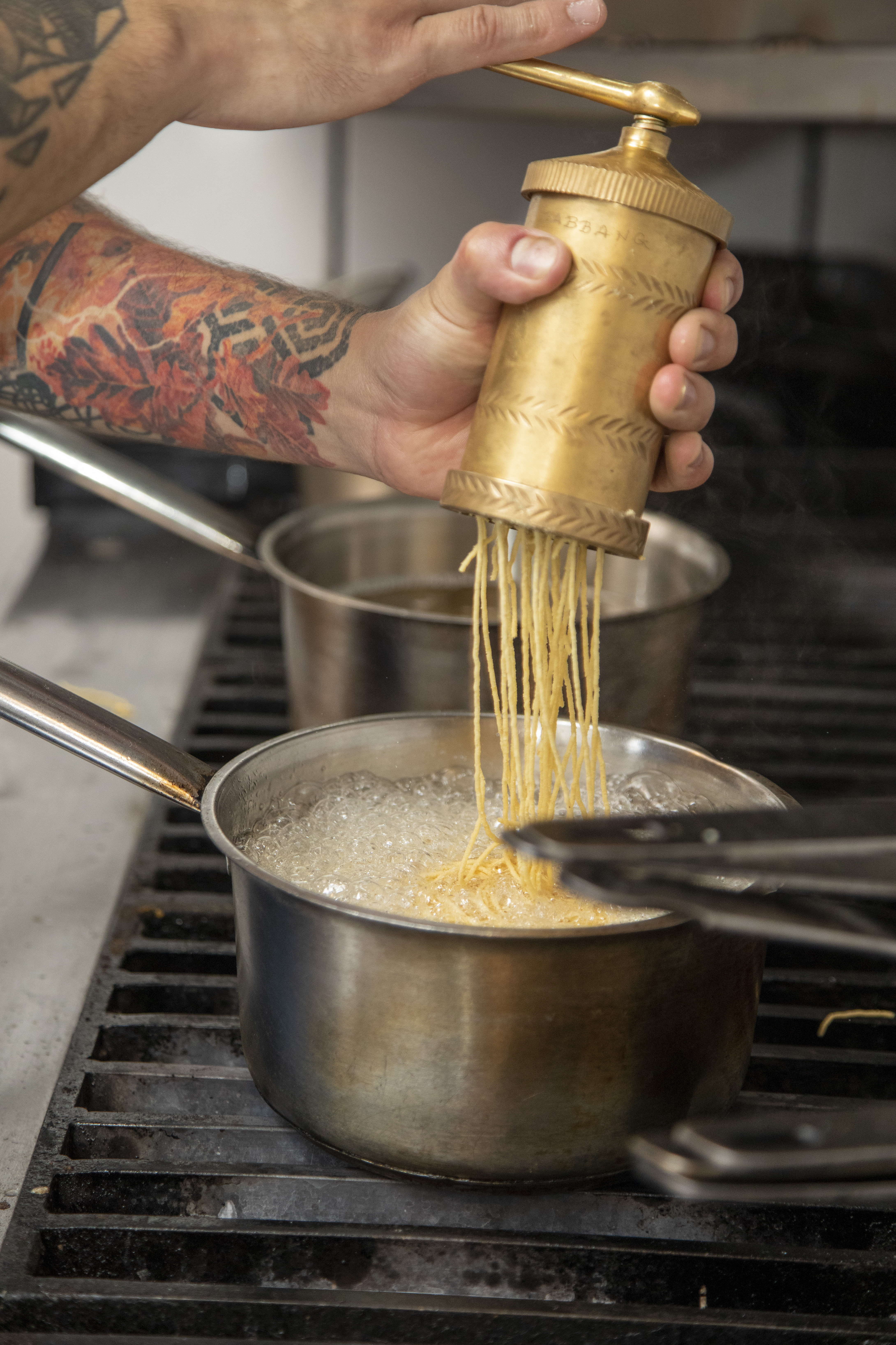 La inspiración me surge en los momentos de necesidad máxima. Cuando llegamos acá y no hay nada, ahí es cuando logro conectar. Eso me pasa desde que soy chico: solo conectaba cuando estaban a punto de echarme, en situaciones críticas. Y ahora lo que busco es tener cocineros que sean completamente lo contrario: muy concentrados, aplicados y constantes. Así yo sé que todos los días los platos van a salir bien. Intento ser mucho más estricto de lo que eran conmigo, hay cosas que yo no les tolero a ellos que a mí me toleraban. Yo creo que eso los beneficia a ellos.