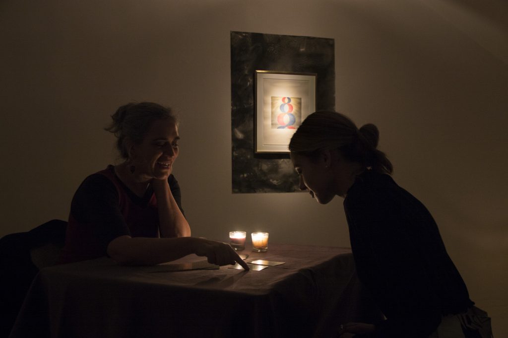 Corro una cortina de terciopelo negro e ingreso a una sala oscura, únicamente iluminada por unas velitas colocadas en la esquina derecha, y la luz instalada sobre el dibujo de pequeño formato expuesto. Una sensación de mística y sacro impregna el aire. A la izquierda se encuentra Daniela, la tarotista, sentada frente a una mesa con sus mazo desplego dispuesta a leer, en voz serena, “ese inconsciente que conoces pero aún no fue nombrado”, nos contó. La idea es hacer una pregunta, elegir la cantidad de cartas que te indique y luego mostrarle una foto de la obra de la exposición que más llamó tu atención. A partir de ese momento la experiencia es personal y varía según cada uno. La mía, aunque en principio me daba vértigo, fue muy interesante.