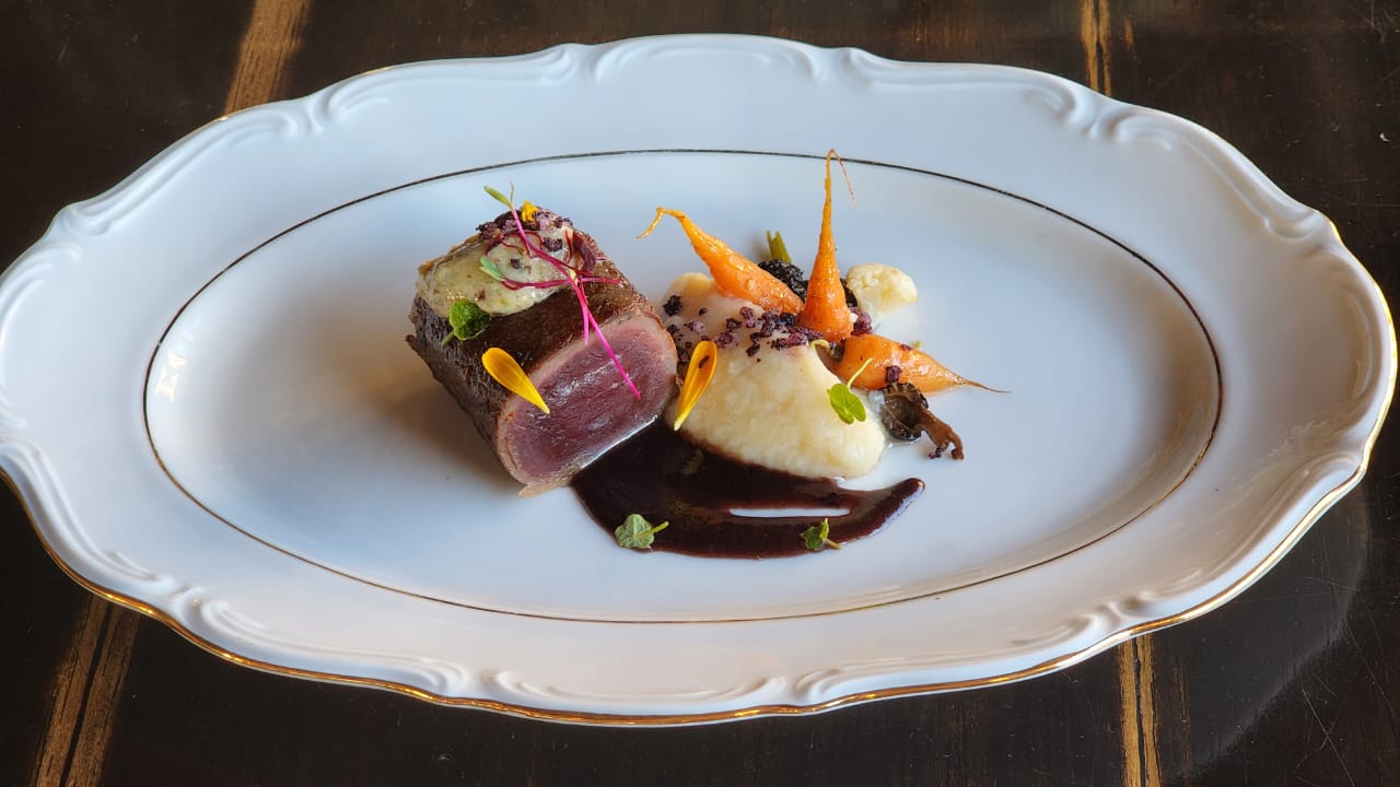 Plato finalista: bife de guanaco sellado con manteca de Tuétano, puré de coliflor, zanahorias glaseadas y crocante de lomo curado. Para maridar eligió Baron B Brut Nature.