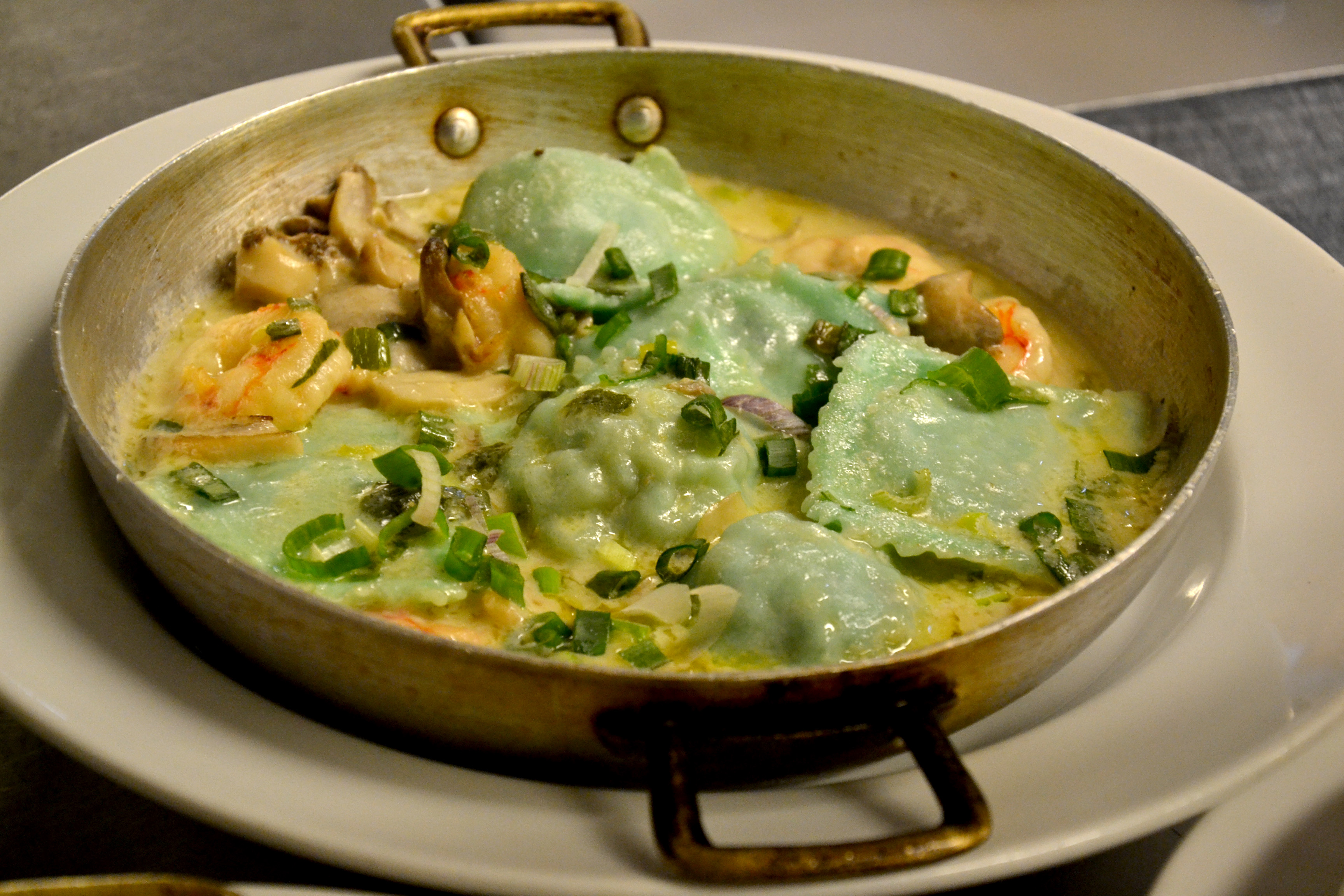La cocina peruana de Puerta del Inca ofrece, como pasta destacada con productos de mar, unos ravioles negros de salmón ahumado, creados por el chef Luis Hizo Martínez. La masa se prepara con tinta de calamar, se rellenan con salmón ahumado marinado (con cebolla, ajo y romero), ricota y queso crema, y se sirven con langostinos flambeados en cognac y una suave crema de verdeo.
