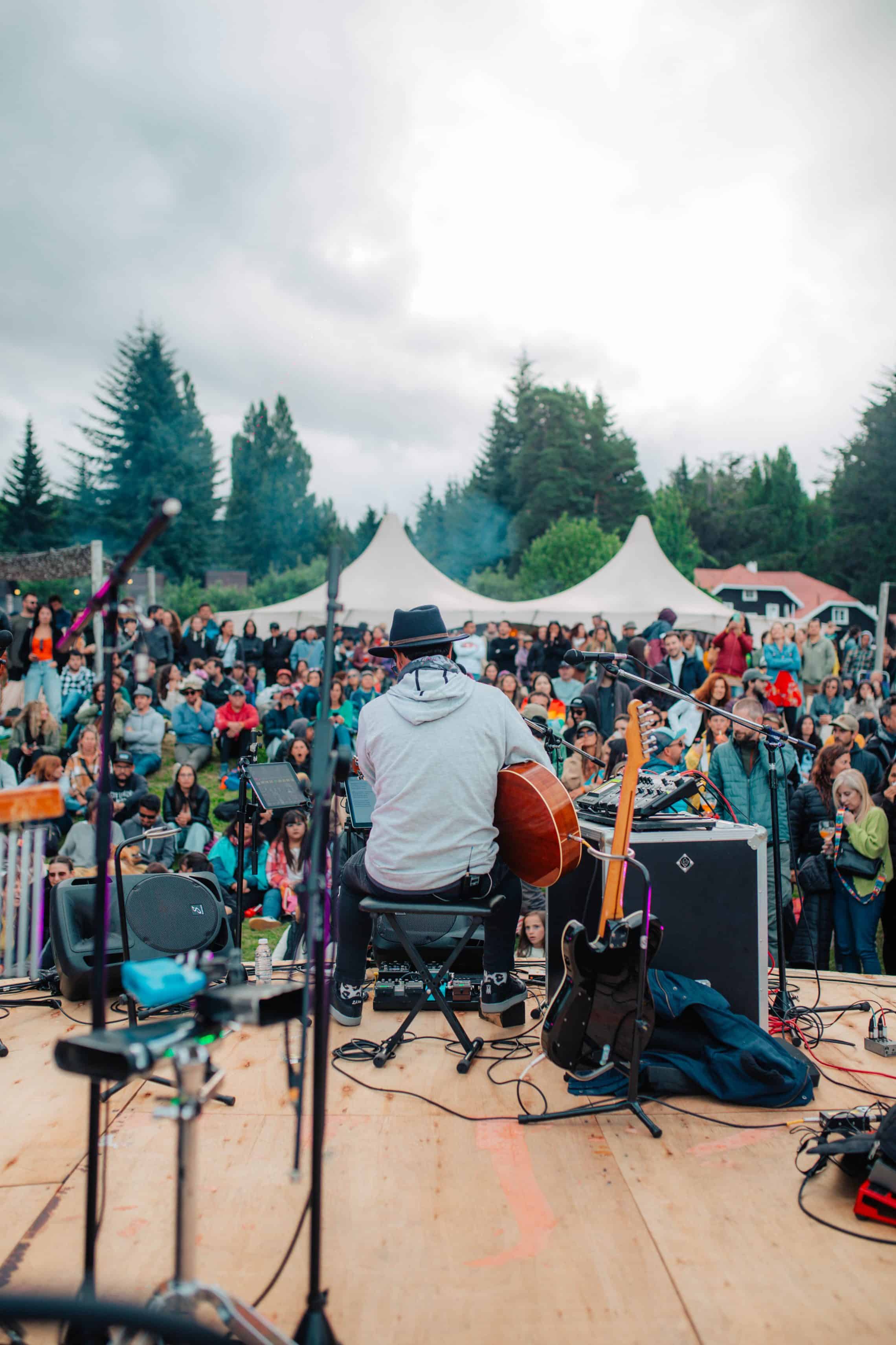 Lucecitas tenues ambientan el espacio, rodeado de carritos de comida, algunos fogones que ya están prendidos y una carpa beduina con estufas, sillones, pufs y mesas que invita a refugiarse de alguna posible lluvia o brisa fría típica del verano en el sur. Estamos en Circe Club de Lago, por escuchar a Lisandro Aristimuño en vivo, en la primera fecha de la segunda edición de “Camping Bariloche”, un festival de música de verano.