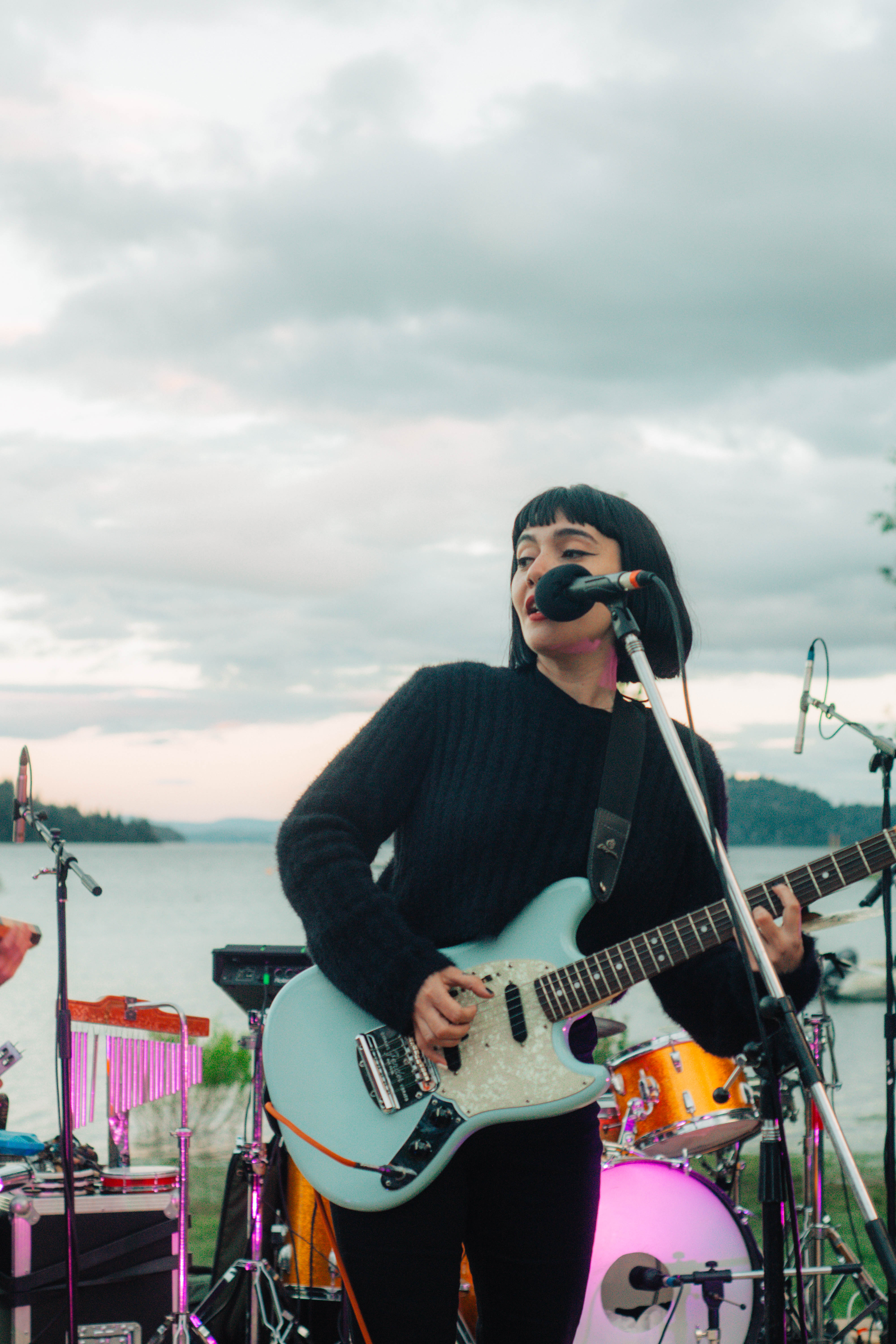 El sol cae cerca de las diez de la noche, por lo que casi todos los shows suceden durante el largo atardecer sureño. Ese momento en el que uno no entiende cómo seguimos afuera, con un poco más de abrigo, pero con pocas ganas de volver a casa. Cuando mirás el reloj y marca las nueve de la noche y de a poco empieza a aparecer una luz naranja y violeta sobre la montaña.