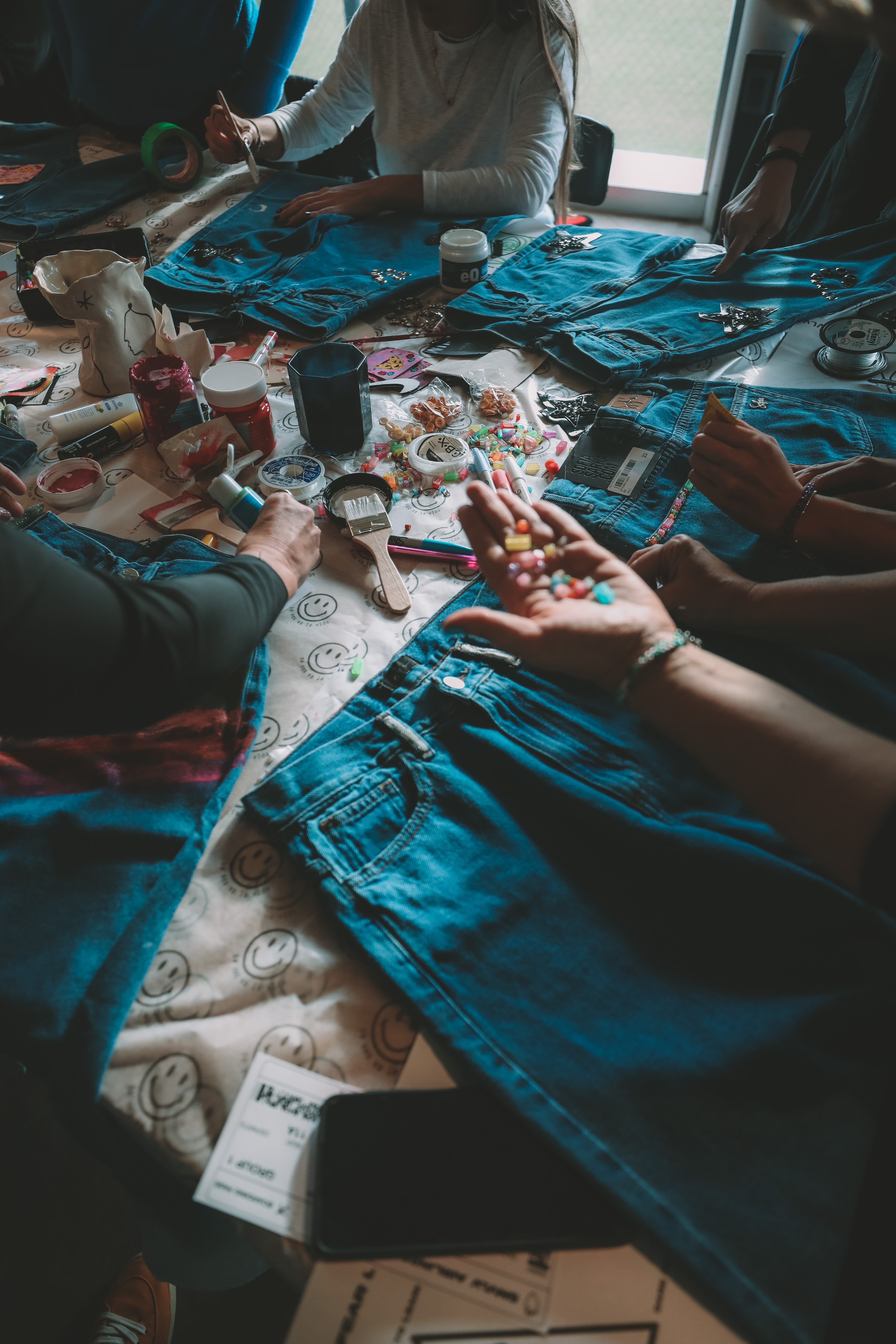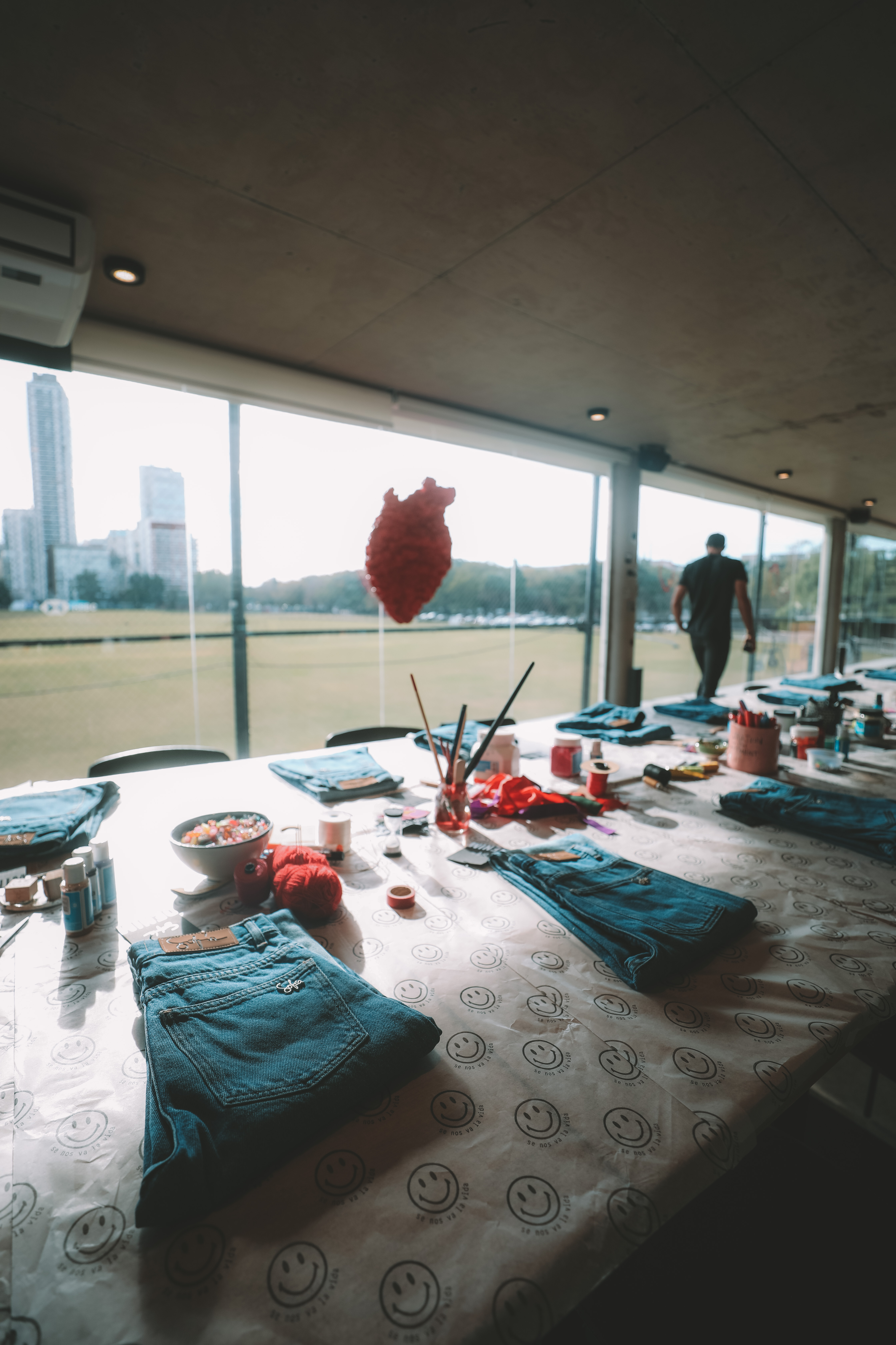Entrando al edificio en el Campo Argentino de Polo me dieron un Boarding Pass que decía: “de: tu mente – a: tu corazón”. Ahí entendí que esto iba a ser profundo y que este tipo de experiencias tienen sentido si vas abierto a entrar en ese mambo. Nos encontramos en la “sala de embarque” un grupo grande de mujeres de distintas edades y subimos todas juntas para “abordar el avión de la creatividad». Ahí nos esperaba un arcoíris visual: un popurrí de materiales de todos los colores – mostacillas, marcadores, acrílicos, pinceles, hilos, parches, tijeras – y frente a cada silla, un jean de Sofi Sarkany.