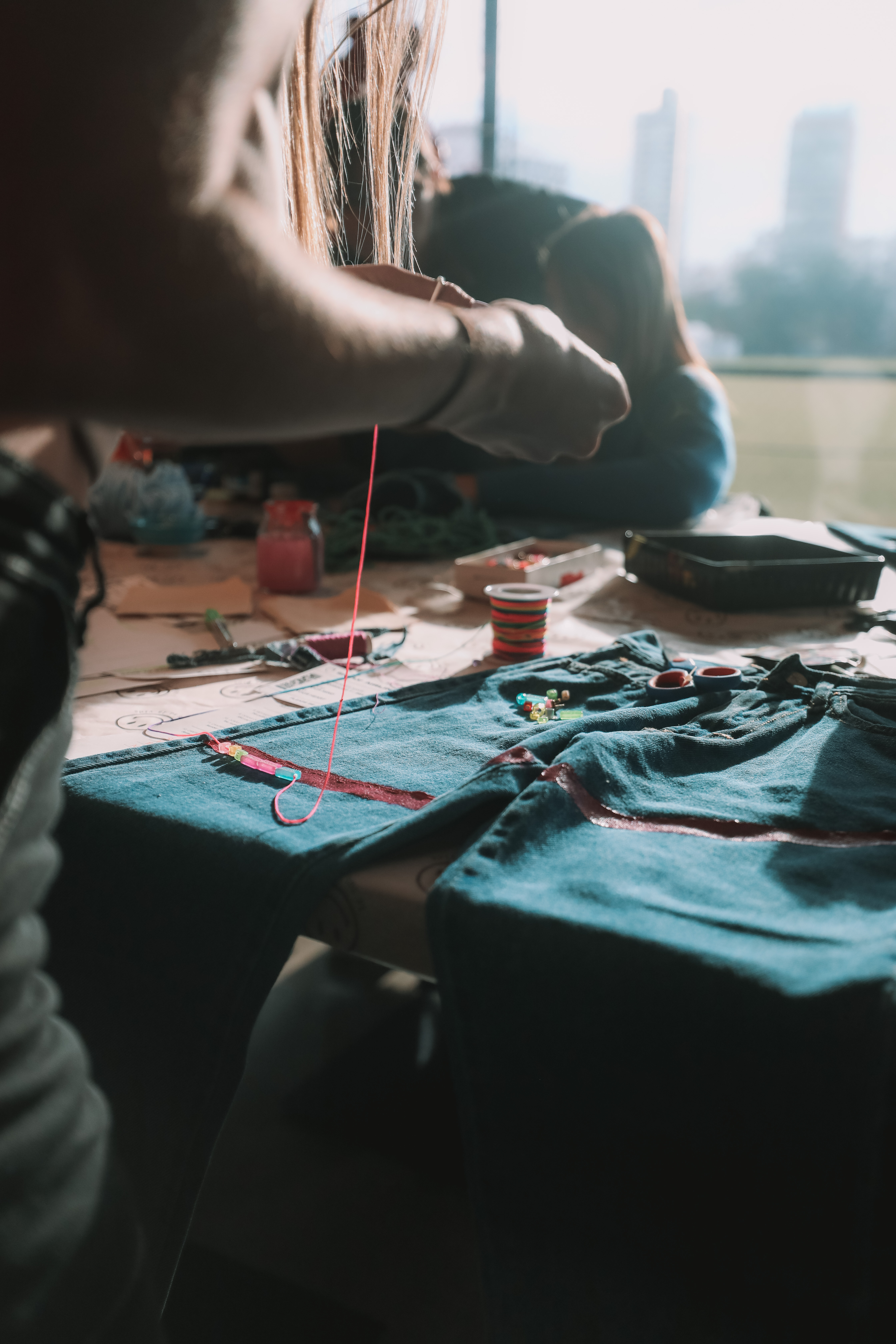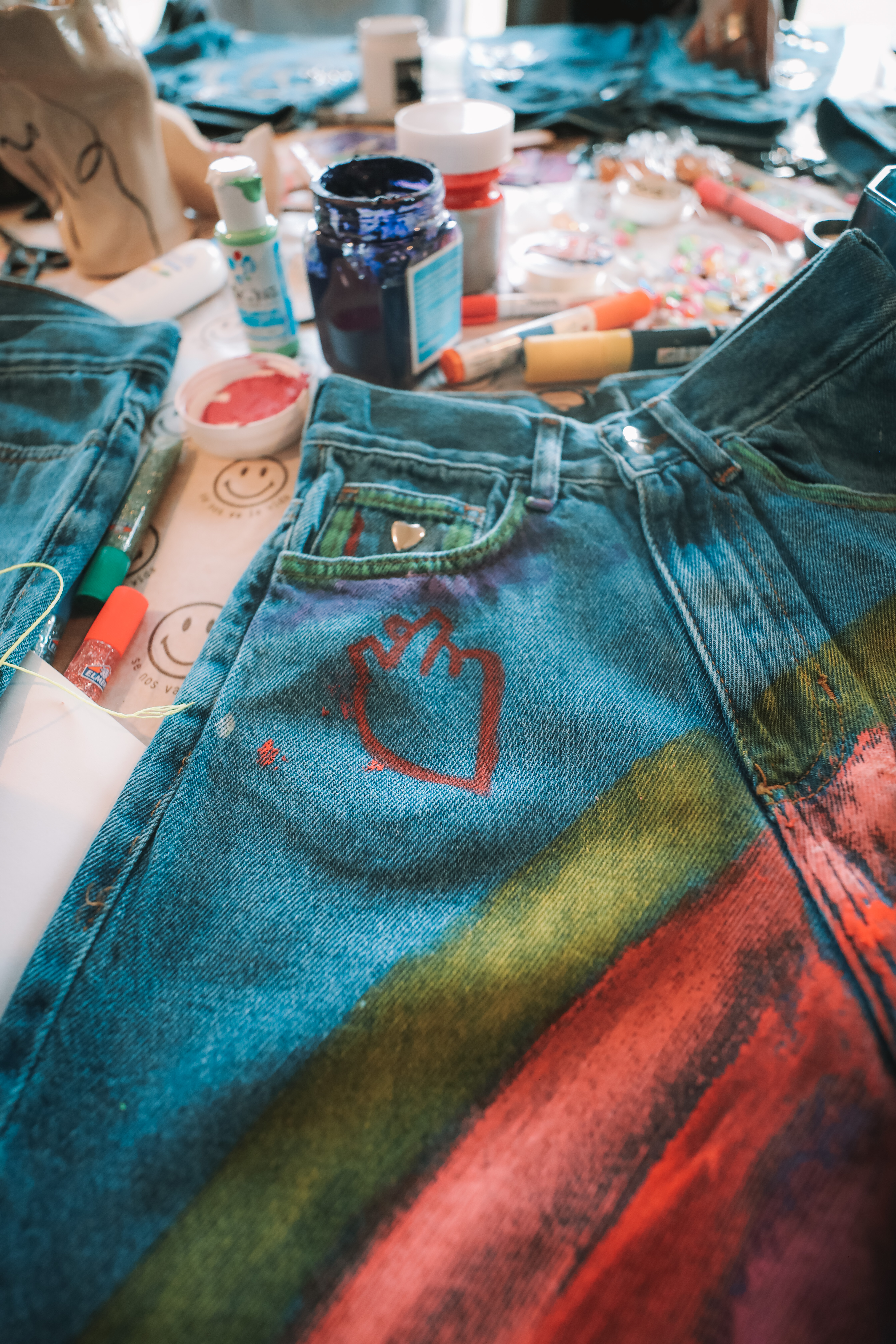 Me incomodó que trabajemos en parejas (siempre preferí hacerlo sola) pero solté y así conocí a Tefi, con quién me sentí cómoda rápido sin la necesidad de hablar mucho. Me incomodó la idea de destruir un jean de marca, hasta que me di cuenta que el talle 23 me entraba con suerte en una pierna. Me incomodó que las dos tengamos que crear algo en conjunto, hasta que descubrimos que tenemos en común el amor por los arcoíris. Me incomodó (y mucho) mirar a los costados y ver que todas ya habían arrancado, mientras yo no largaba ni una pincelada por querer hacer algo “que guste” pero que también me represente. Error: ya estaba pensando en hacer para el otro.