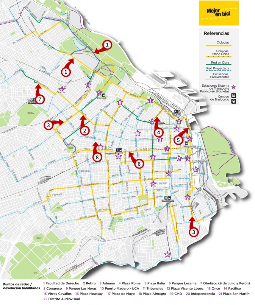 La que empieza en la plaza Fuerza Aérea Argentina (la de la Torre de los Ingleses y la estación de tren Retiro), sigue por Antártida Argentina y luego por Bouchard y Azopardo. Es la ciclovía del bajo y si bien su trayecto es interesante y ecléctico – linda con Puerto Madero, se ve la Fragata Libertad, pasa por el Luna Park – está llena motitos, gente que camina en el carril para bicis, camiones con containers en los cruces, autos y camionetas estacionados con balizas en la ciclovía. Y su trazado es muy complejo.