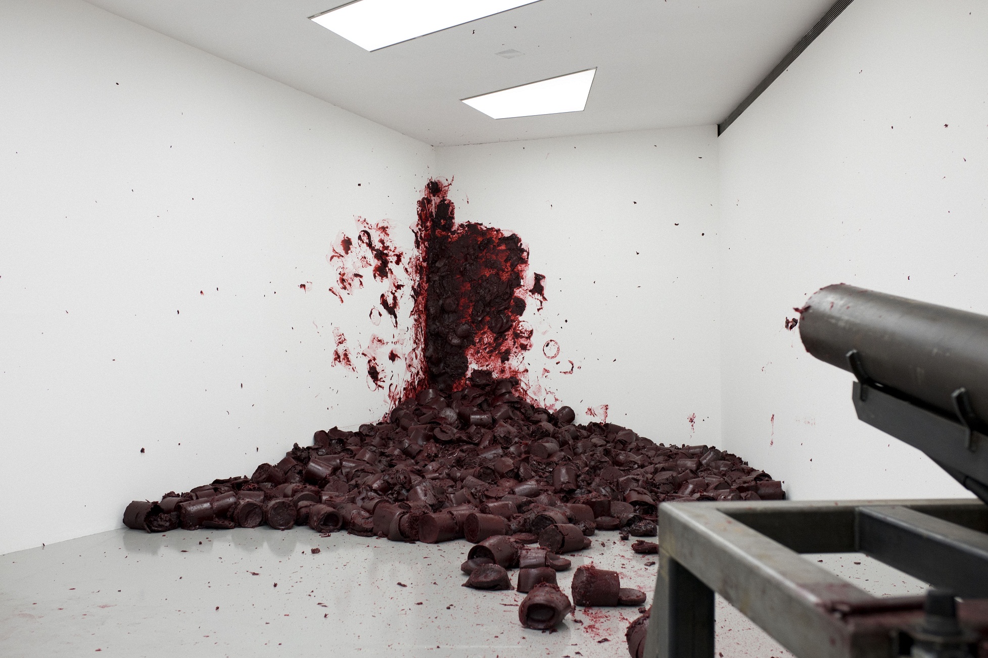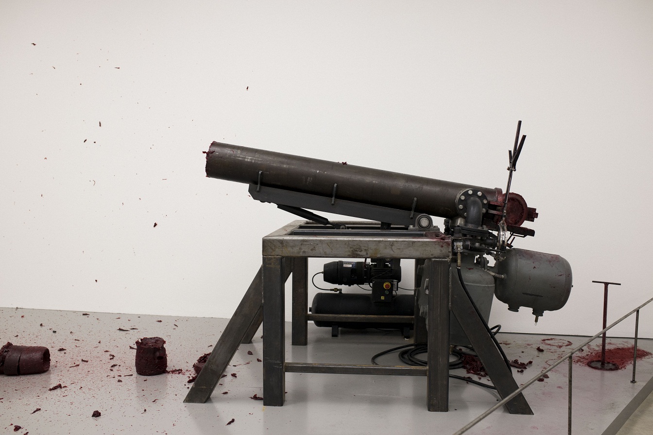 Esta obra es, por afano, la más impactante de la muestra. Un cañón dispara, ocho veces por día, balas de cera color rojo sangre, a una esquina. Es una performance que nos interpela y nos trae sensaciones de destrucción, violencia y agresividad. Al mismo tiempo, y paradójicamente, no podemos negar que hay una obra que se está gestando a partir de cada disparo: una configuración nueva e inesperada. Así, la destrucción y construcción se encuentran y se amalgaman. Y además, la cera es un elemento transformable, que genera una obra dinámica y cambiante.