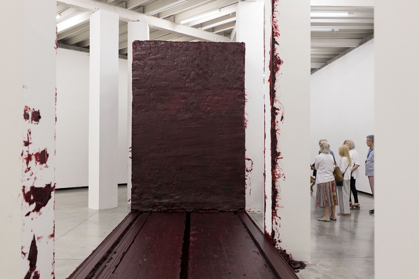 La obra más imponente de la muestra en términos de escala. La cera “rojo Kapoor” vuelve a ser la protagonista, pero en este caso no ligada a la violencia, sino que es usada como vehículo material. Un muro o bloque que, a diferencia del resto, se desplaza, y en ese movimiento, va modelándose y dejando su huella. Las columnas, en su paso, se llenan de cera y el espacio se transforma. El título de la obra, “Svayambhu”, remite a una palabra en sánscrito que significa autogenerado o autogestionado; una instalación que se genera a sí misma. Lo más interesante de este concepto es que, una vez montada, la obra tiene sus propios mecanismos, su propio movimiento y devenir, independientes del artista. Se relaciona con el origen y la transformación, dos temas recurrentes en Kapoor.