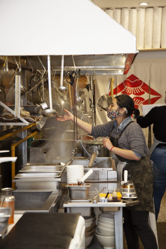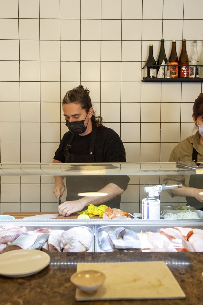 Desde la ventana se ve la cocina que tiene una maquinaria y trabajo impresionante. Sobre la propuesta, Roy cuenta: “Queríamos hacer comidas tradicionales, que se comen un montón, pero en un formato amigable. No queríamos un restaurante sino algo casual. La gente necesitaba este tipo de formatos de cocina japonesa, más desestructurados. A mí me interesaba generar productos de cocina japonesa que sean fáciles de replicar en un buen producto en alta escala, yo vengo del sushi, que si lo querés llevar a escala se complica porque una mano de una persona no es igual a la de la otra”.