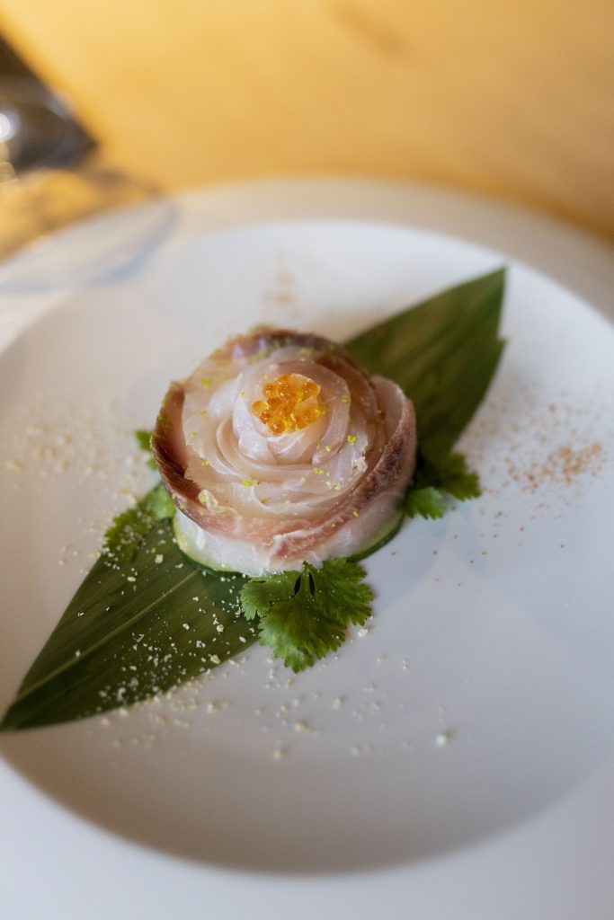 Siempre la base es la pesca blanca del día con fusiones; la entrada es un sashimi y un nigiri, y después hay geishas, usuzukuri (finas láminas de pesca blanca del día con huevas de trucha) e isobe ague (salmón envuelto en algas al estilo tempura, con guacamole, salsa ponzu y agridulce). Nozomi significa “Esperanza”; es una esperanza hacia el futuro, post pandémico. El chef principal es Juan Matsuoka y es un artista de la cocina. Probamos la mismísima perfección: un pescado blanco con lenguado, chernia y lisa, huevas de salmón, yuzu, sichimi, y pimienta japonesa.