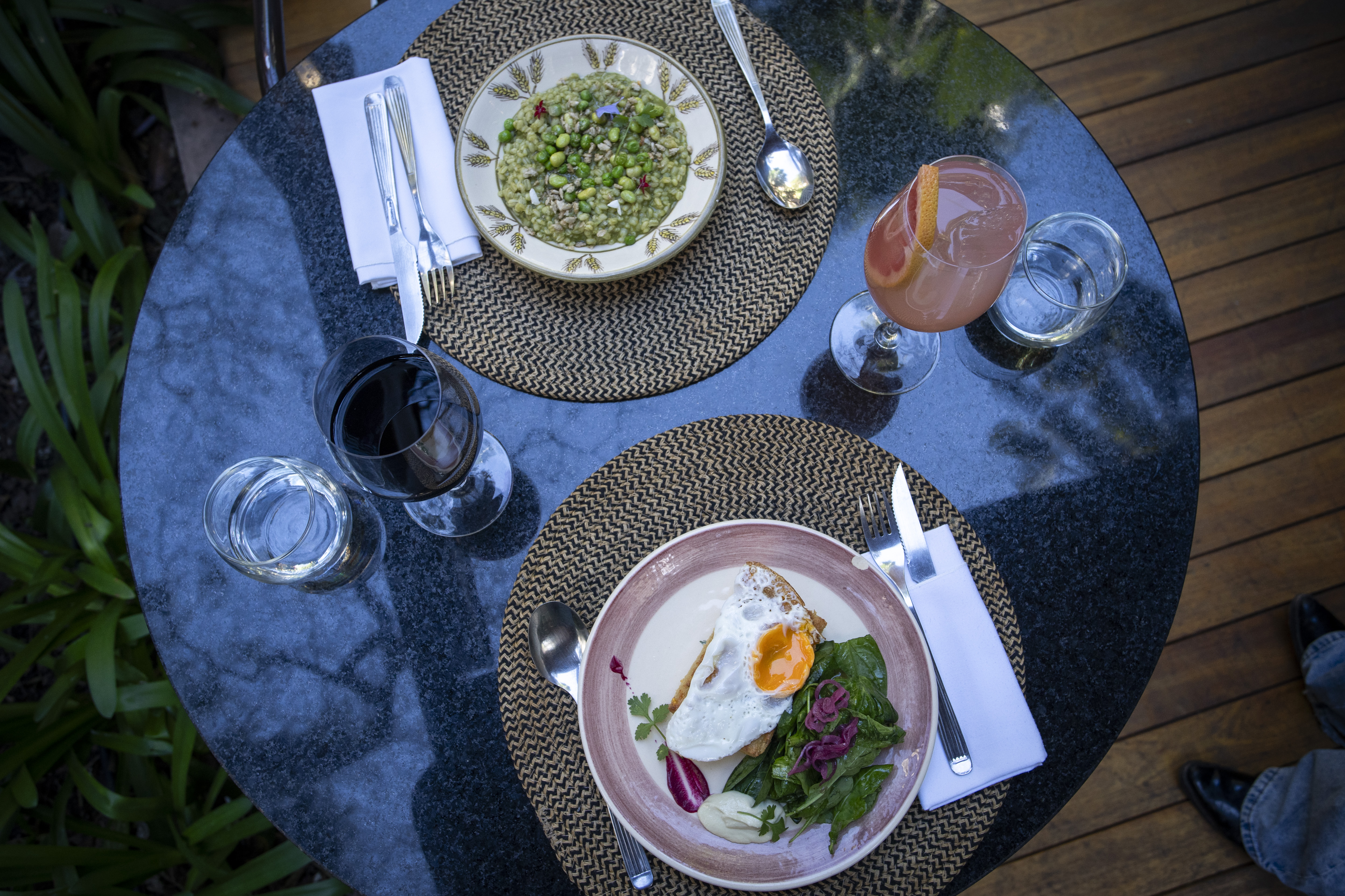 Es increíble sentarse en una de las cuatro mesas sobre los canteros frondosos. Admirar hacia un lado el inmenso jardín en diversos tonos de verde y celestes mosaicos y, hacia el otro, la cocina que trabaja apacible dentro de un invernadero abrazado por hojas de palmeras. Pero lo más inverosímil es que, aunque cueste creerlo, ese escenario onírico está inserto en plena ciudad.