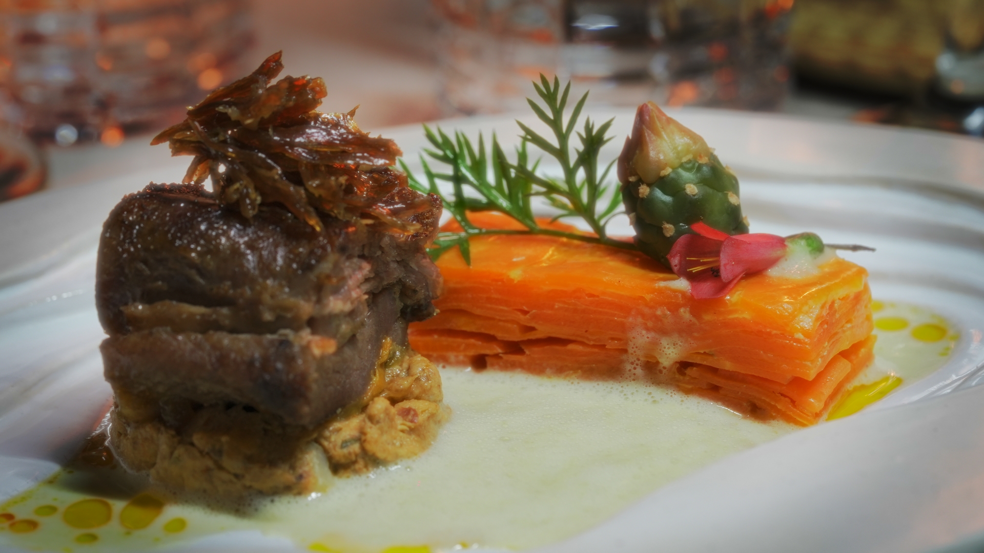 Para el concurso, la estrella de su plato era el cabrito y lo aprovecharon de manera integral, con tres propuestas que llevaban diferentes técnicas de cocción y conservación: confitura de cabrito laqueada con mermelada de tuna de las mujeres de La Cañada, charqui de cabrito –técnica ancestral para la conservación de la carne-, y paté de cabrito – donde se aprovecha el resto de la res-. La etiqueta que eligieron para maridarlo es Baron B Brut Nature.