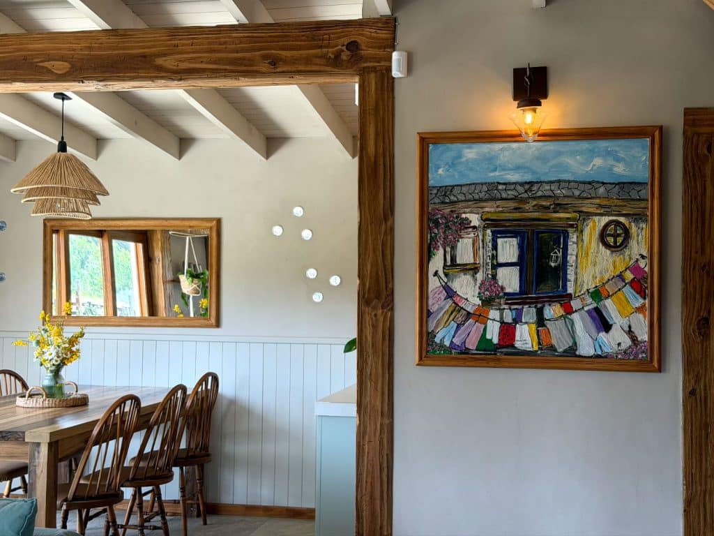 Agua caliente por termotanque solar, sistema de tratamiento de aguas grises y negras mediante filtros botánicos. En una época donde la vida se acelera y olvidamos que el tiempo es nuestra mayor riqueza, La Gracia te espera. también repleta de arte y muebles antiguos:  «Mi abuela tenía un campo en Azul , así que me traje muebles de allá, como ya los tenía en mi cabeza, pensé en diseño y el interiorismo de La Gracia en función de ellos». Con un lindísimo aparador antiguo que al abrirlo te da la gratísima sorpresa de estar repleto de juego, desde el de la vida al ajedrez, palabras cruzadas y El Estanciero. Por supuesto, hay cartas y algunos libros, de novelas cortas a El Principito e historietas de Condorito. Para que el plan sea redondo también hay yerba, café; y si luego la idea es cocinar, tiene especiero con ajo en polvo, pimentón, tomillo, ají molido, comino, cúrcuma, nuez moscada, curry. Porque el planazo, alguna noche, será quedarse a disfrutar de la casita y cocinar. Tal es así que en cuanto llegamos y cruzamos la tranquera, se acercó un pescador para ofrecernos lo que pescó hoy.