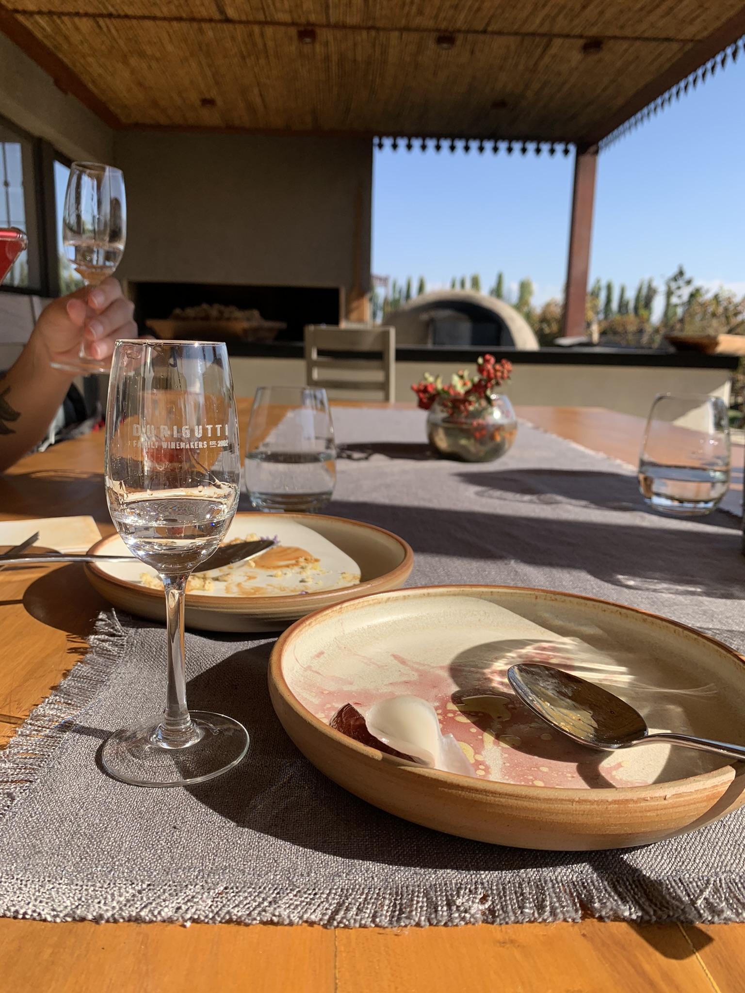 Es una de las propuestas más nuevas de la zona, y su búsqueda está en acercar la gastronomía y el vino a los jóvenes y mendocinos (que no suelen ir a comer a las bodegas). “Soy enemigo del protocolo. El vino se toma en cualquier lado: si hay un vaso, se toma en vaso. Si hay que ponerle hielo, le ponemos hielo. Acá invitamos a vivir la experiencia de un pueblo, solo comemos lo que crece en Las Compuertas”, cuenta Héctor Durigutti, uno de los dueños.