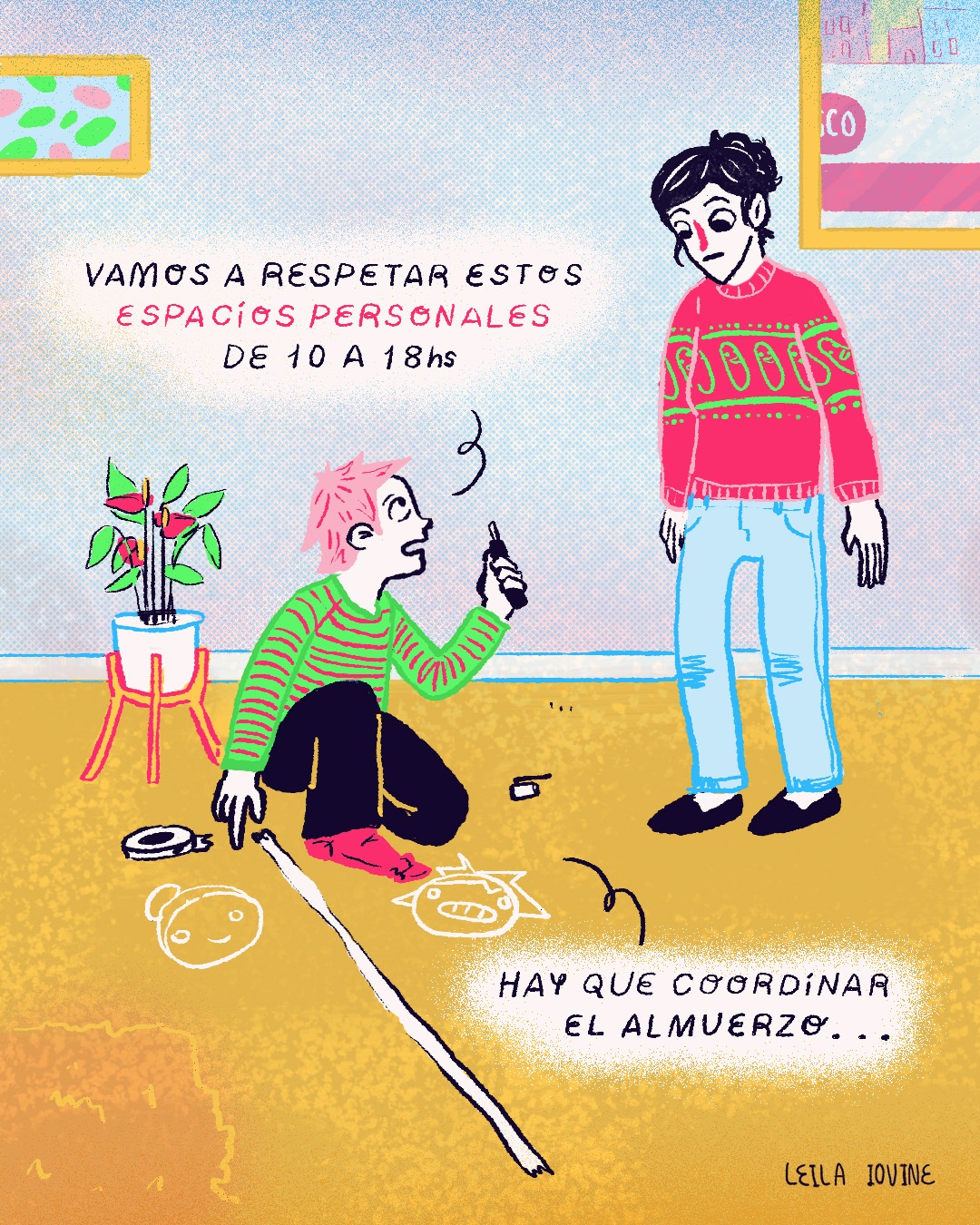 «Treinta y cinco días como si fuéramos una planta de interior (crónica de una convivencia en cuarentena)». Por Olivia Gallo. Ilustración: Leila Iovine.