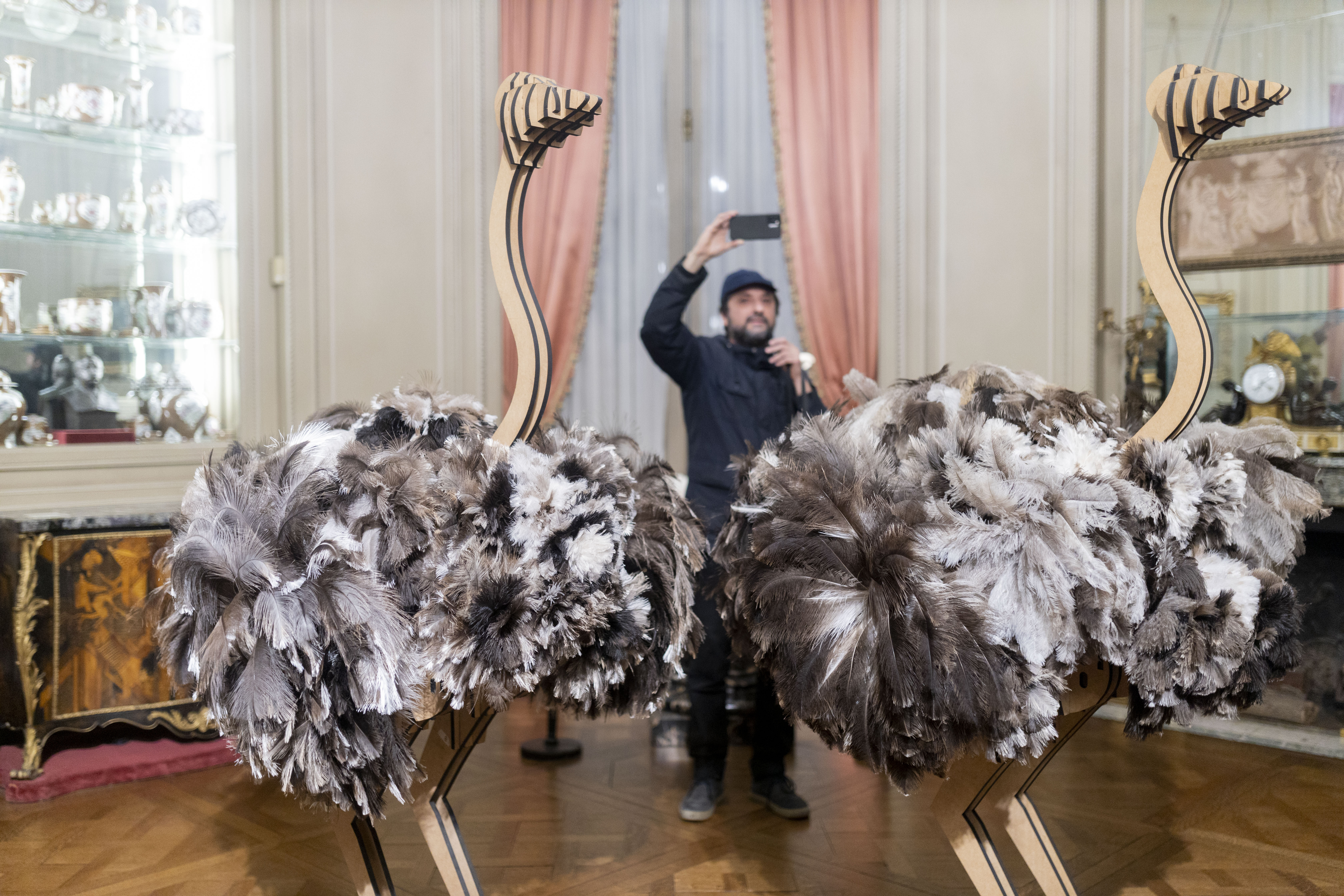 Dos avestruces majestuosas reciben al público en el Salón de Madame. Están compuestas por un esqueleto de madera con una grilla de perforaciones y un plumaje generado a través de la inserción de plumeros de limpieza doméstica, que el artista le compró a vendedores ambulantes. A través de plumas de ñandú y de avestruz, el animal “se reconstituye”. Un indicio de la capa política de la obra, es que el plumero se fabrica dentro de una economía informal. “También tiene que ver con una idea-fuerza que atraviesa toda la muestra, y tiene que ver con que los elementos de la vida cotidiana, desean una vida más elevada; el plumero quiere volver a ser avestruz”. Gran parte del carnaval de Brasil, se hace con plumas de avestruz, por ejemplo. Así, la ex avestruz, y posterior plumero, vuelve a su origen.