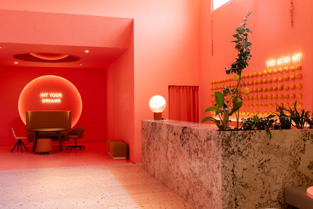 En línea con el nombre del Cowork crearon distintas leyendas en neón como “HIT your dreams”, “The acid HIT” y “HIT your goals”, que acompañan el espíritu lúdico y creativo que distingue al espacio.