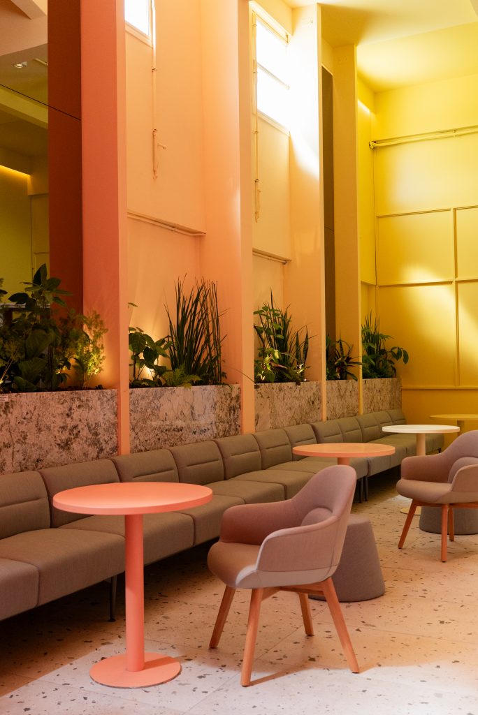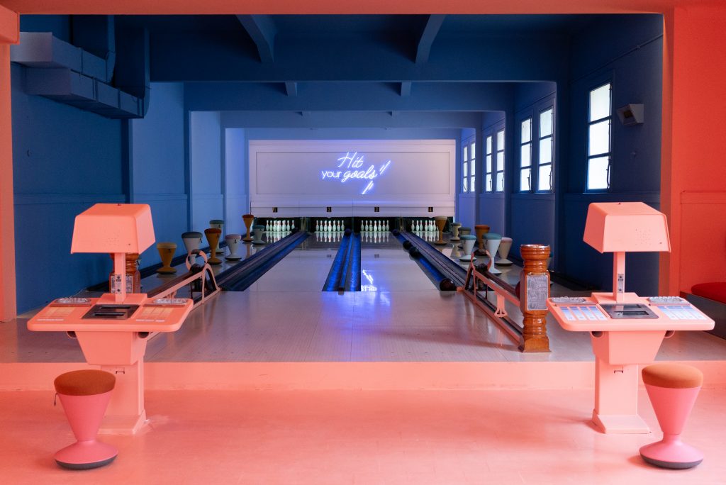 Mediante una especie de túnel de colores ingresamos al café y al bowling, los sectores ya existentes en el edificio que fueron asignados al estudio para crear esta experiencia vibrante y sensorial, y que permiten representar el ambiente descontracturado de la oficina del futuro.