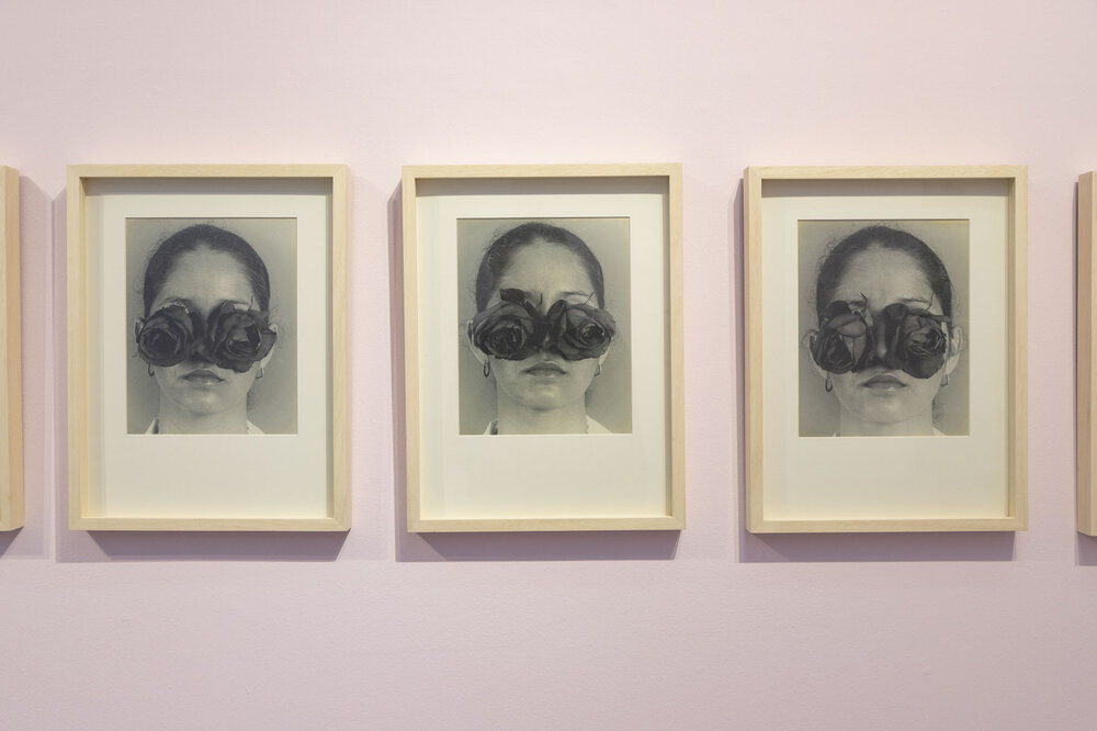 La serie que más llama mi atención es la que se encuentra a la izquierda de la sala. Siete fotos en blanco y negro. Una al lado de la otra. Siete caras sin ojos. Estos fueron reemplazados por dos flores, rosas. A medida que avanzamos a lo largo de la pared, las caras apenas cambian su inclinación o gesto, lo que va mutando son las flores. Las acompañamos en su proceso de vida, desde que son algo pequeñas y caben cómodas dentro de la cavidad ocular, a su brillante floración, hasta que empiezan a marchitarse. Una vida entera en siete caras. Un proceso fuerte e impactante donde el cuerpo se presta como la herramienta de exploración.