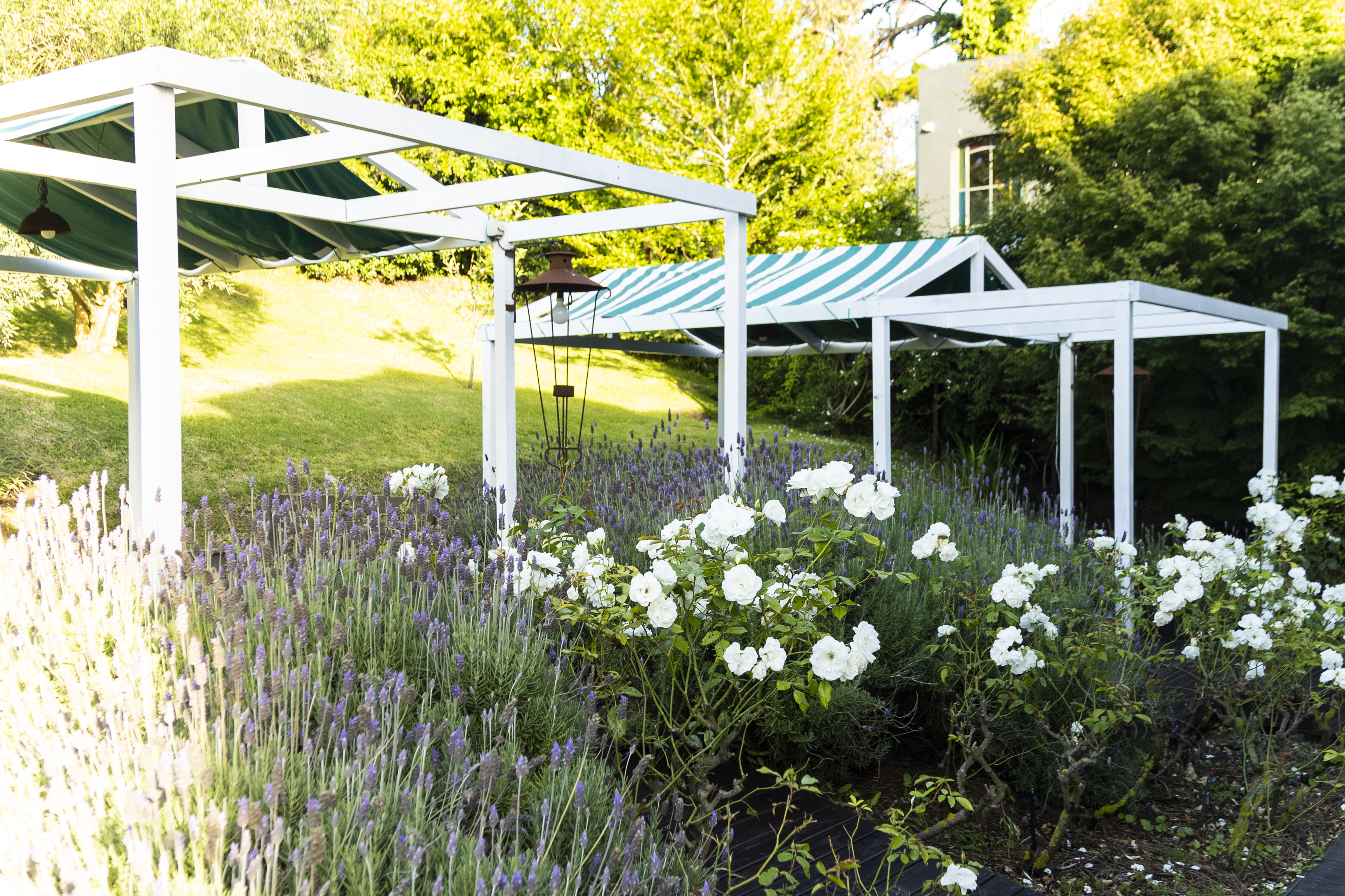 Algo parecido pasa con el jardín. Cuando atravesás la puerta de vitrales y te dejás llevar por el deck de madera, terminás en un jardín que los amantes de la naturaleza seguro tendrían guardado en algún tablero de Pinterest. Un caminito de agapanthus, arbustos de lavandas y rosas blancas custodian dos pérgolas que, homenajeando a las carpas históricas con sus telas a rayas verdes y blancas, también hacen de livings al aire libre con silloncitos, mesas y un poco de sombra. Al final del camino, y elevada sobre una pequeña loma teñida del color de las flores, hay una pileta, con el agua que cae en tres cascadas “infinitas” y reposeras con el bosque pinamarense acariciándote la espalda.