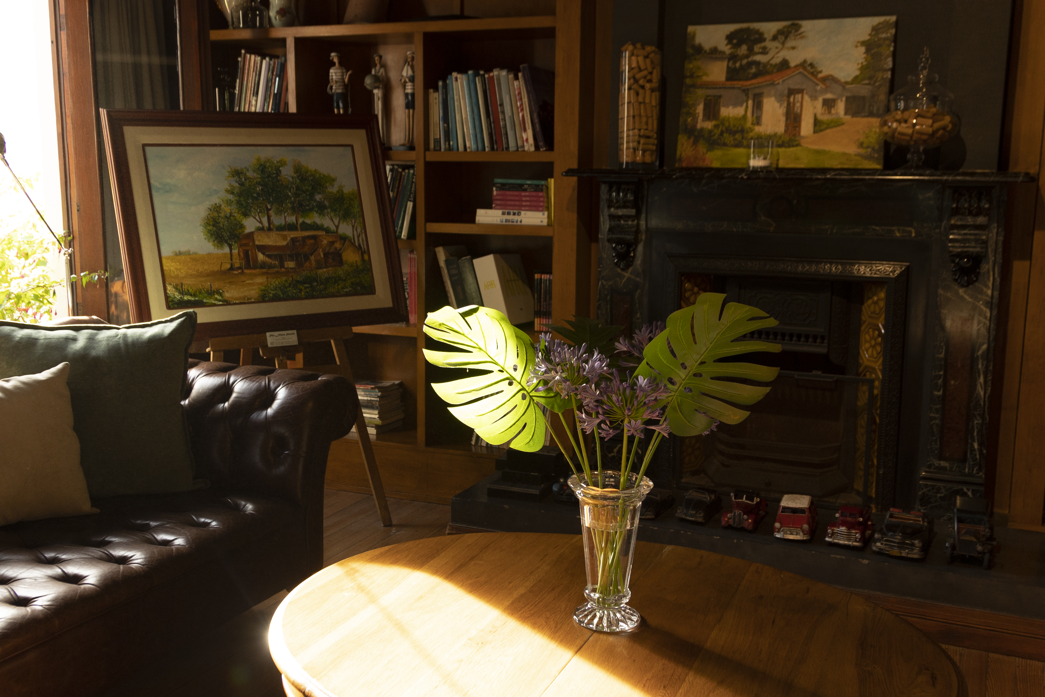 La sala de estar la ambientaron como un living familiar, con una gran biblioteca que los huéspedes pueden usar como si fuera propia, sillones y butacas retapizados y una gran chimenea cortejada por una colección de autitos antiguos. Los cuadros de artistas locales en atriles, la araña colgante, el jarrón de flores frescas y la mesa de comedor (que, desde que la incorporaron es la preferida del desayuno), terminan de construir una postal acogedora que hace que el tiempo que pases bajo ese techo a dos aguas, te olvides de que estás en una hostería.